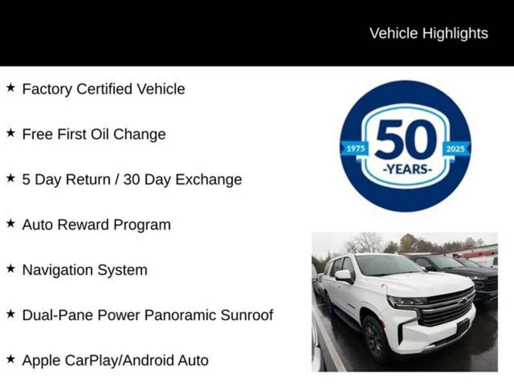 CARFAX One-Owner.Recent Arrival! 2022 Chevrolet Suburban LT EcoTec3 5.3L V8 10-Speed Automatic with Overdrive 4WD 4D Sport Utility Summit White Factory Certified Vehicle, Free First Oil Change, 5 Day Return / 30 Day Exchange, Auto Reward Program, Apple CarPlay/Android Auto, Dual-Pane Power Panoramic Sunroof, Navigation System.Odometer is 38989 miles below market average!Certified. Chevrolet Certified Pre-Owned Details:* Roadside Assistance* Powertrain Limited Warranty: 72 Month/100,000 Mile (whichever comes first) from original in-service date* 24 months/24,000 miles (whichever comes first) Certified Pre-Owned Scheduled Maintenance Plan and 3 days/150 miles (whichever comes first) Vehicle Exchange Program. SiriusXM 3-month trial subscription.* Warranty Deductible: $0* 172 Point Inspection* Vehicle History* Limited Warranty: 12 Month/12,000 Mile (whichever comes first) from certified purchase date* Transferable WarrantyFor better peace of mind all our used vehicles have a 127-point inspection and come with a 5-day return, 30-day exchange (As-Is vehicles are excluded). Our exclusive Auto Rewards Program provides better value with Free First Oil change, Free Pa State Safety inspections, discounts for local merchants and more. Plus, you can earn up to $2000 towards your next vehicle just by servicing with Fred Beans! As Fred Beans always says, our used cars are better because our reputation depends on it.Although every reasonable effort has been made to ensure the accuracy of the information contained on this site, absolute accuracy cannot be guaranteed. This site, and all information and materials appearing on it, are presented to the user as is without warranty of any kind, either express or implied. All vehicles are subject to prior sale. Price does not include applicable tax, title, license, processing and/or documentation fees.  Vehicles shown at different locations are not currently in our inventory (Not in Stock) but can be made available to you at our location within a reasonable date from the time of your request, not to exceed one week. Residency restrictions may apply.