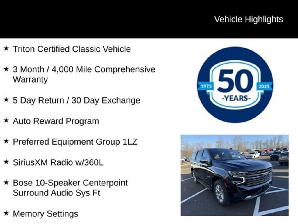 Elevate your driving experience with this 2022 Chevrolet Tahoe Premier. This full-size SUV is a true masterpiece, blending unparalleled capability, refined luxury, and cutting-edge technology. Triton Certified Classic Vehicle 3 Month / 4,000 Mile Comprehensive Warranty 5 Day Return / 30 Day Exchange Auto Reward Program 4 Brand New Tires! LPO, MOLDED SPLASH GUARDS (dealer-installed) Preferred Equipment Group 1LZPowered by the robust EcoTec3 5.3L V8 engine mated to a smooth-shifting 10-Speed Automatic with Overdrive, this Tahoe Premier delivers exceptional performance and efficiency, with an impressive 15 city/20 highway MPG. Conquer any terrain with its 4WD drivetrain, while the Magnetic Ride Control Suspension ensures a refined and responsive driving experience.The interior of this Tahoe Premier is a true sanctuary, with premium features that elevate your every journey. Indulge in the Bose 10-Speaker Centerpoint Surround Audio System, enjoy seamless connectivity with SiriusXM Radio w/360L, and stay informed with the Enhanced Driver Information Center. The Hands-Free Rear Power Programmable Liftgate, Memory Settings, and Remote Start ensure your comfort and convenience, while the Heated Steering Wheel and Heated & Ventilated Driver & Front Passenger Seats provide unparalleled luxury.This Triton Certified Classic Vehicle comes with a 3 Month / 4,000 Mile Comprehensive Warranty, giving you peace of mind and confidence in your purchase. With the 5 Day Return / 30 Day Exchange policy, you can test-drive this Tahoe Premier with the assurance that it's the right fit for you.Elevate your driving experience and make this 2022 Chevrolet Tahoe Premier your own. Contact us today to schedule a test drive and discover the exceptional value and uncompromising quality that this vehicle has to offer.