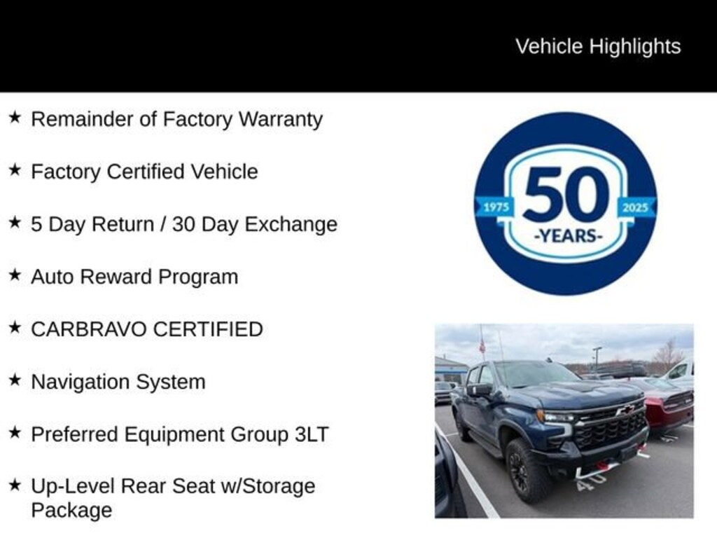 As a Chevrolet Certified Pre-Owned vehicle, this Silverado 1500 ZR2 has undergone a rigorous 172-point inspection and comes with a comprehensive warranty package. You'll enjoy 24 months/24,000 miles of scheduled maintenance, a 12-month/12,000-mile limited warranty, and a 72-month/100,000-mile powertrain warranty from the original in-service date. Plus, you'll receive a 3-month trial subscription to SiriusXM, so you can stay entertained on the road.