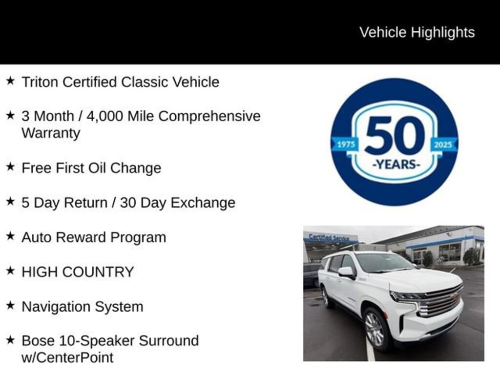 The Triton Certified Classic designation means this Suburban has undergone a rigorous inspection and reconditioning process, ensuring it meets the highest standards of quality and reliability. With a comprehensive 3-month/4,000-mile warranty and a free first oil change, you can drive with confidence, knowing your investment is protected.
