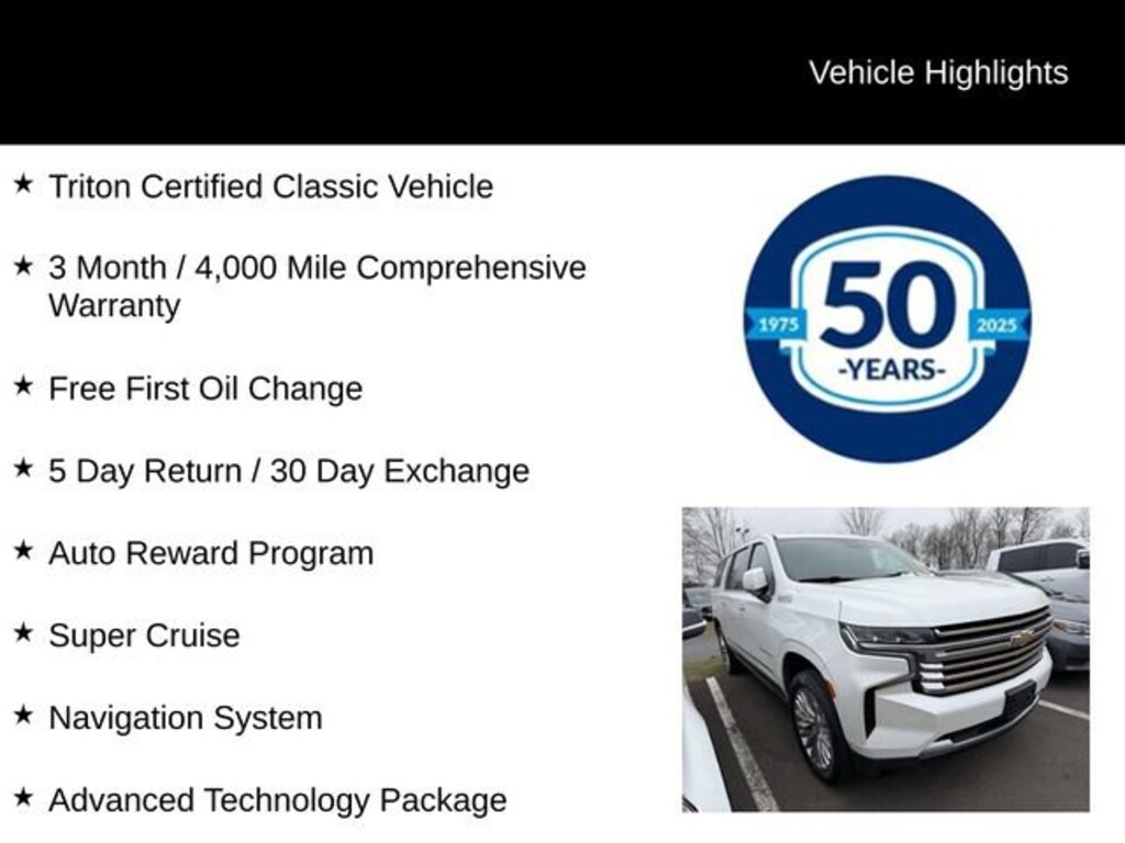 Experience the pinnacle of luxury and capability with the 2024 Chevrolet Suburban High Country. This exceptional SUV is a true masterpiece, combining advanced technology, exceptional comfort, and uncompromising performance to elevate your driving experience. Triton Certified Classic Vehicle 3 Month / 4,000 Mile Comprehensive Warranty Free First Oil Change 5 Day Return / 30 Day Exchange Auto Reward Program Super Cruise Advanced Technology Package Rear Seat Media System Power-Retractable Assist Steps Panoramic Sunroof Max Trailering PackagePowered by the potent EcoTec3 6.2L V8 engine and paired with a responsive 10-speed automatic transmission, the Suburban High Country delivers exceptional power and efficiency, with an impressive 14 city and 18 highway MPG. The advanced 4WD system ensures confident handling in any terrain, while the Magnetic Ride Control Suspension provides a remarkably smooth and composed ride.Stepping inside, you'll be greeted by a cabin that exudes sophistication and attention to detail. The perforated leather seating surfaces, heated and ventilated front seats, and heated second-row outboard seats offer unparalleled comfort. The Rear Seat Media System with dual 12.6-inch screens and Bluetooth headphones keeps your passengers entertained, while the Bose 10-speaker surround sound system provides an immersive audio experience.The Suburban High Country is more than just a luxury SUV it's a certified classic that has been meticulously inspected and comes with a comprehensive warranty. With its Triton Certified status, you can drive with confidence, knowing that this vehicle has been thoroughly evaluated and deemed worthy of the Triton seal of approval.Elevate your driving experience with the 2024 Chevrolet Suburban High Country. Packed with advanced technology, premium features, and exceptional capability, this SUV is the ultimate expression of Chevrolet's commitment to excellence. Visit our showroom today and discover the difference for yourself.