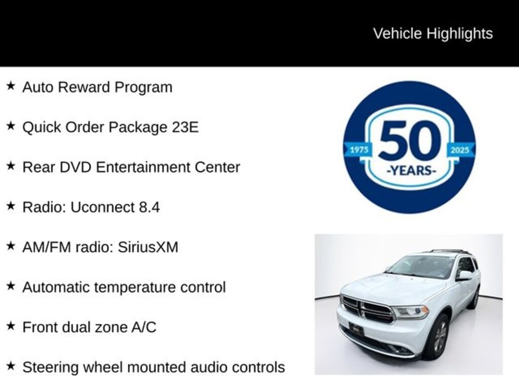Recent Arrival! 2015 Dodge Durango Limited 3.6L V6 Flex Fuel 24V VVT 8-Speed Automatic AWD 4D Sport Utility Bright White Clearcoat Auto Reward Program, AWD, 8.4" Touchscreen Display, AM/FM radio: SiriusXM, Auto-dimming door mirrors, Auto-dimming Rear-View mirror, Automatic temperature control, Blu-Ray Compatible Dual Screen Video, Exterior Parking Camera Rear, Front dual zone A/C, Fully automatic headlights, Garage door transmitter, Heated front seats, Heated rear seats, Heated steering wheel, Leather Trimmed Bucket Seats, Memory seat, Power 8-Way Driver Memory 8-Way Passenger Seats, Power driver seat, Power passenger seat, Power Sunroof, Quick Order Package 23E, Radio: Uconnect 8.4, Rear DVD Entertainment Center, Rear Parking Sensors, Rear-Seat Video System, Remote keyless entry, Steering wheel mounted audio controls.