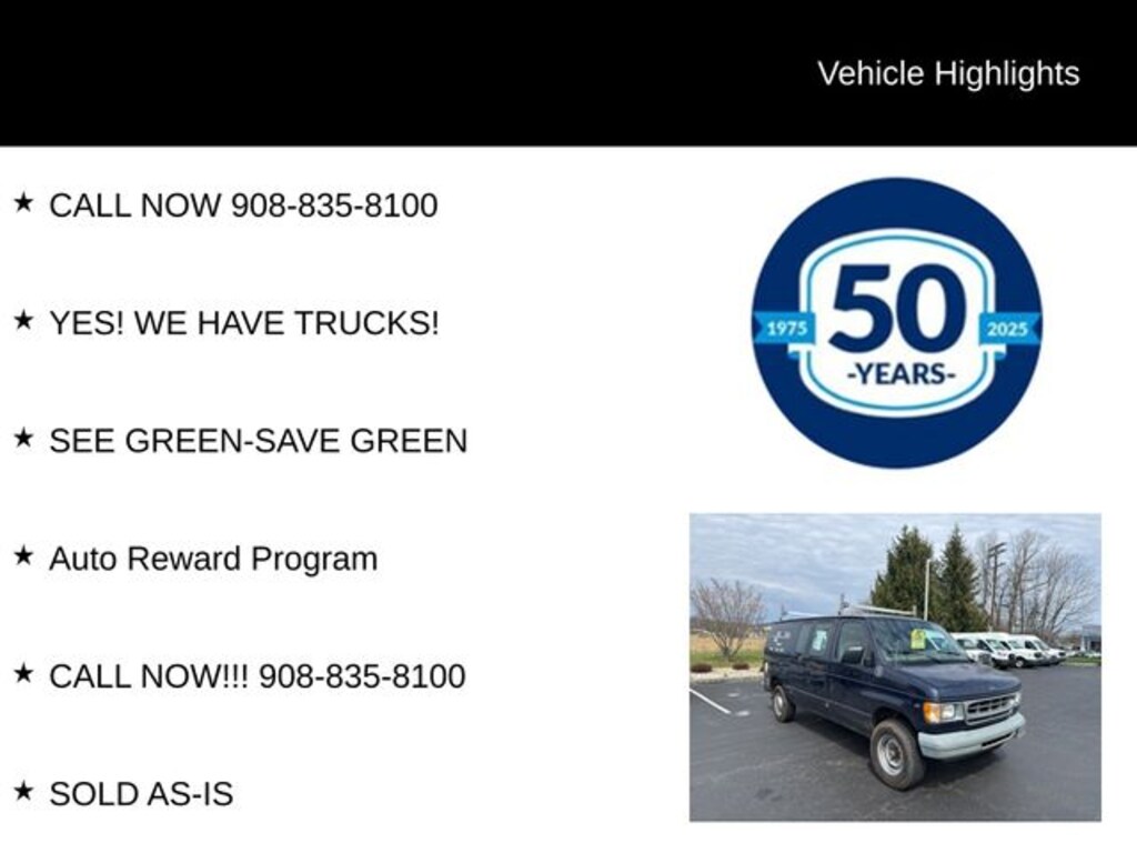 CALL NOW 908-835-8100, YES! WE HAVE TRUCKS!, SEE GREEN-SAVE GREEN, Auto Reward Program, CALL NOW!!! 908-835-8100, SOLD AS-IS, AN ESTIMATE FOR NEEDED REPAIRS IS AVAILABLE, THE LIST OF NEEDED REPAIRS INCLUDES: REAR BRAKES, 2 FRONT LOWER BALL JOINTS, NEW SHIFTER COLUMN BUSHINGS, REPAIRING DOOR LATCHES, REPLACE A DOOR HINGE, 1 NEW TIRE, OIL AND FILTER CHANGE, AIR AND FUEL FILTER SERVICED, SOME BODY WORK/REPAIR IS NEEDED ON THE FRONT FENDER AND REAR QUARTER PANEL, BRAKES MEASURE 10 MM FRONT AND 0 MM REAR, TIRES MEAURE 4/32, 12/32 FRONT AND 12/32 REAR, THE VEHICLE IS SOLD AS-IS AND THE BUYER IS RESPONSIBLE FOR COMPLETING ALL REPAIRS, THE RETAIL PRICE HAS BEEN ADJUSTED (LOWERED) TO ACCOUNT FOR THE NEEDED REPAIRS., 4-Wheel Antilock Braking System, ABS brakes. Recent Arrival! 2001 Ford E-350SD Commercial 5.4L V8 EFI 4-Speed Automatic RWD 3D Cargo Van True Blue Clearcoat Metallic