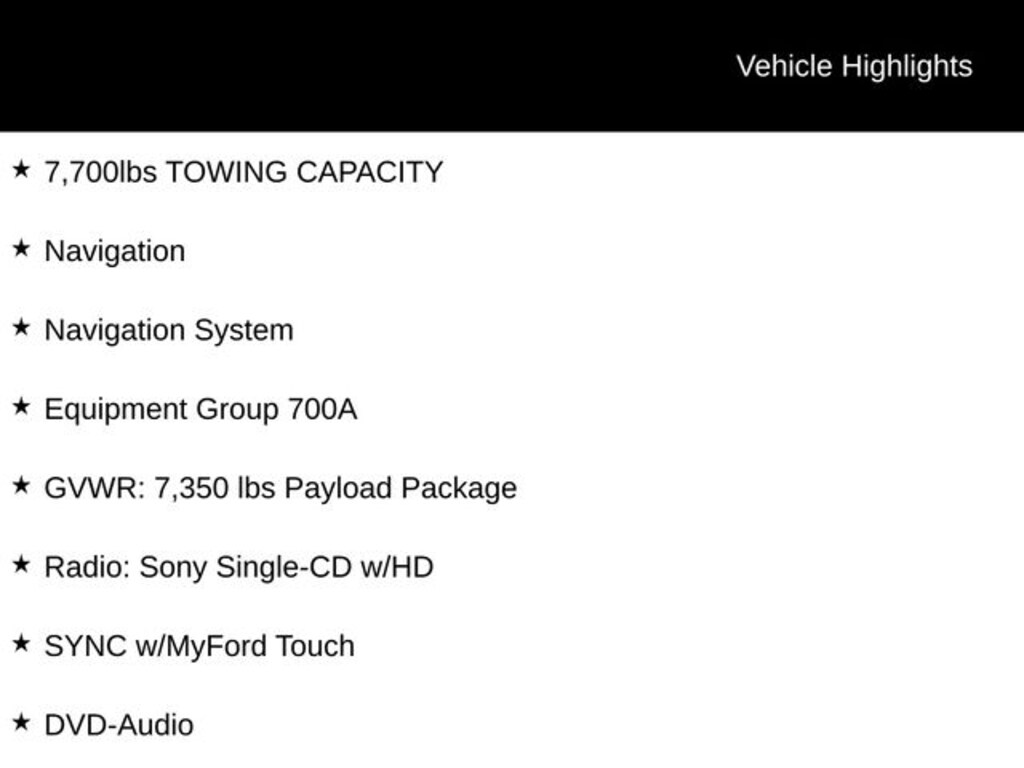 7,700lbs TOWING CAPACITY, 4WD, 10 Speakers, 20" Polished Aluminum Wheels, 4-Wheel Disc Brakes, ABS brakes, Adjustable pedals, Air Conditioning, AM/FM radio: SiriusXM, Auto tilt-away steering wheel, Auto-dimming door mirrors, Auto-dimming Rear-View mirror, Automatic temperature control, Black Unique Leather Bucket Seats, Bodyside moldings, Bumpers: body-color, CD player, Compass, Delay-off headlights, Driver door bin, Driver vanity mirror, Dual front impact airbags, Dual front side impact airbags, DVD-Audio, Electronic Stability Control, Equipment Group 700A, Exterior Parking Camera Rear, Front anti-roll bar, Front Bucket Seats, Front Center Armrest, Front dual zone A/C, Front fog lights, Front wheel independent suspension, Fully automatic headlights, Garage door transmitter, GVWR: 7,350 lbs Payload Package, Heated door mirrors, Heated front seats, Heated second row seats, High-Intensity Discharge Headlights, Illuminated entry, Low tire pressure warning, Memory seat, Navigation, Navigation System, Occupant sensing airbag, Outside temperature display, Overhead airbag, Overhead console, Overhead Console w/Single Storage Bin, Panic alarm, Passenger vanity mirror, Pedal memory, Power door mirrors, Power driver seat, Power Moonroof, Power passenger seat, Power steering, Power windows, Premium audio system: Sony, Radio data system, Radio: Sony Single-CD w/HD, Rain sensing wipers, Rear Parking Sensors, Rear reading lights, Rear seat center armrest, Rear step bumper, Rear window defroster, Remote keyless entry, Security system, Speed control, Speed-sensing steering, Split folding rear seat, Steering wheel memory, Steering wheel mounted audio controls, SYNC w/MyFord Touch, Tachometer, Telescoping steering wheel, Tilt steering wheel, Traction control, Trailer Brake Controller, Turn signal indicator mirrors, Variably intermittent wipers, Ventilated front seats.