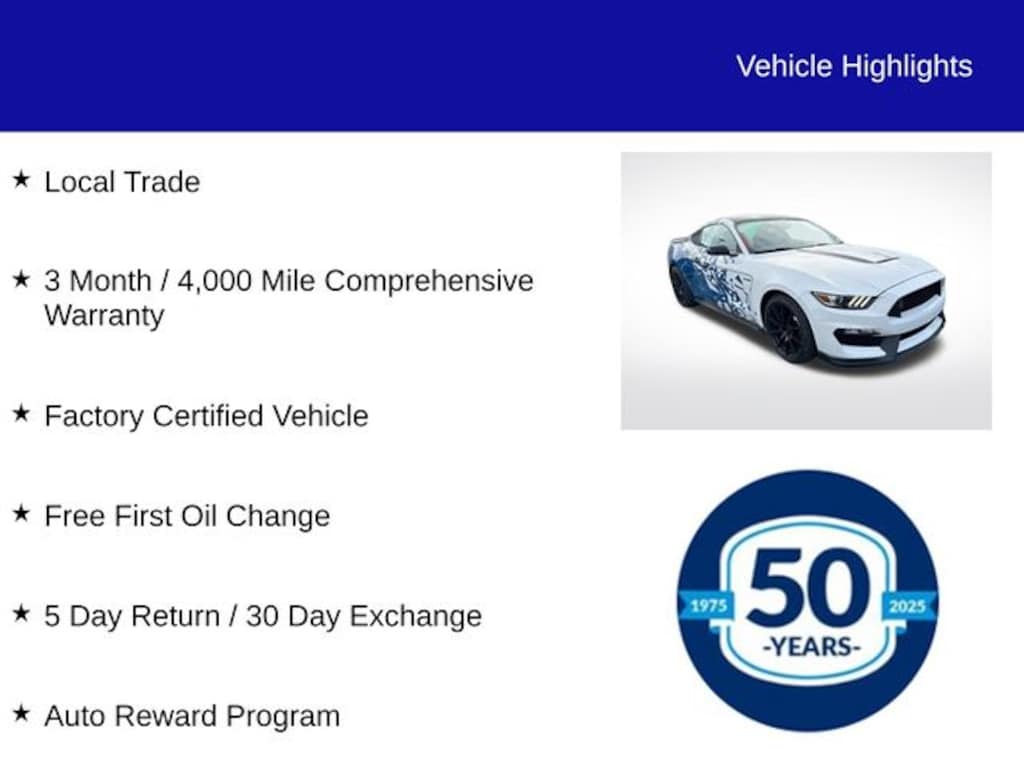 Recent Arrival! 2018 Ford Mustang Shelby GT350 5.2L Ti-VCT V8 Tremec 6-Speed Manual RWD 2D Coupe Oxford White Local Trade, 3 Month / 4,000 Mile Comprehensive Warranty, Factory Certified Vehicle, Free First Oil Change, 5 Day Return / 30 Day Exchange, Auto Reward Program, 4-Wheel Disc Brakes, 6 Speakers, ABS brakes, Adaptive suspension, Air Conditioning, Alloy wheels, AM/FM radio, AM/FM Stereo/Single CD Player, Auto-dimming Rear-View mirror, Block heater, Brake assist, Bumpers: body-color, Compass, Delay-off headlights, Driver door bin, Driver vanity mirror, Dual front impact airbags, Dual front side impact airbags, Electronic Stability Control, Emergency communication system: 911 Assist, Exterior Parking Camera Rear, Four wheel independent suspension, Front anti-roll bar, Front Bucket Seats, Front Center Armrest, Front reading lights, Fully automatic headlights, High-Intensity Discharge Headlights, Illuminated entry, Knee airbag, Low tire pressure warning, Occupant sensing airbag, Outside temperature display, Overhead airbag, Overhead console, Panic alarm, Passenger door bin, Passenger vanity mirror, Power door mirrors, Power steering, Power windows, Radio data system, Rear anti-roll bar, Rear window defroster, RECARO Cloth/Miko Suede Sport Seats, Remote keyless entry, Security system, Speed control, Speed-sensing steering, Speed-Sensitive Wipers, Split folding rear seat, Spoiler, Sport steering wheel, Steering wheel mounted audio controls, SYNC Communications & Entertainment System, Tachometer, Telescoping steering wheel, Tilt steering wheel, Traction control, Trip computer, Variably intermittent wipers, Voltmeter, Wheels: 19" x 10.5" Fr/19" x 11" Rr Ebony Black.