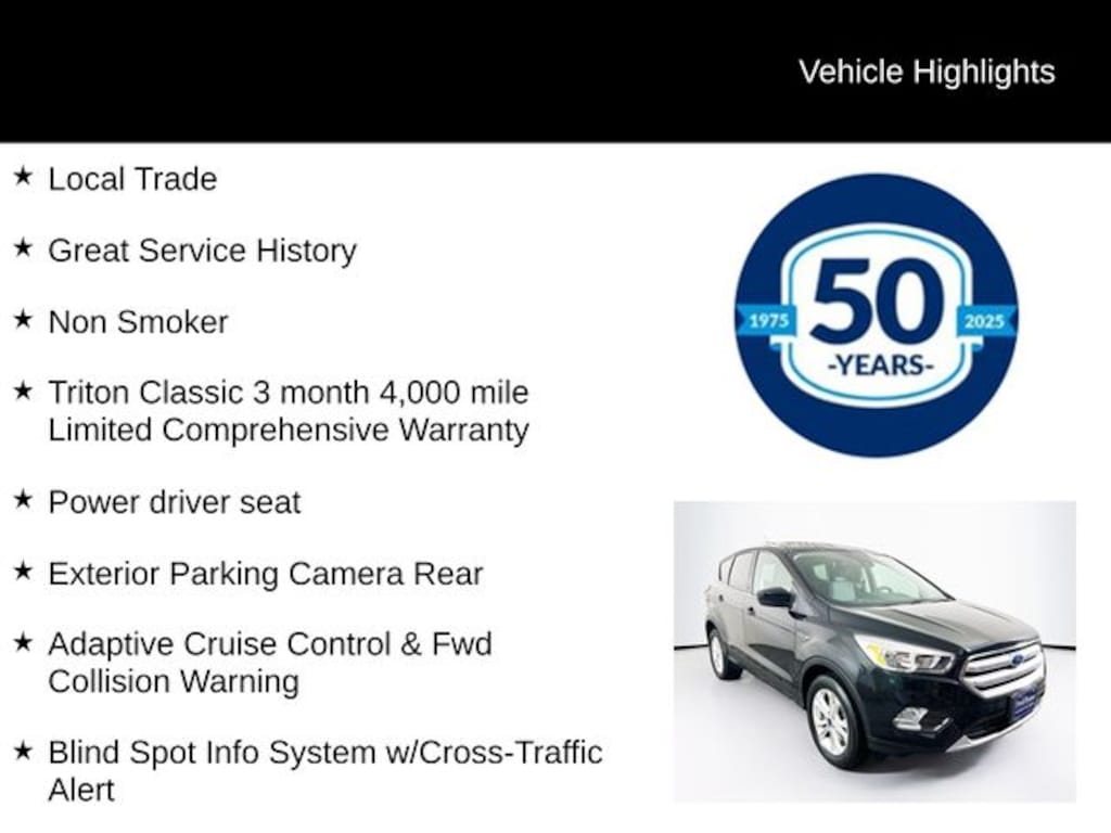 2019 Ford Escape SE 1.5L EcoBoost 6-Speed Automatic 4WD 4D Sport Utility Black Local Trade, Great Service History, Non Smoker, Triton Classic 3 month 4,000 mile Limited Comprehensive Warranty, 4WD, Adaptive Cruise Control & Fwd Collision Warning, AppLink/Apple CarPlay and Android Auto, Blind Spot Info System w/Cross-Traffic Alert, Exterior Parking Camera Rear, Heated front seats, Lane-Keeping System, Power driver seat.