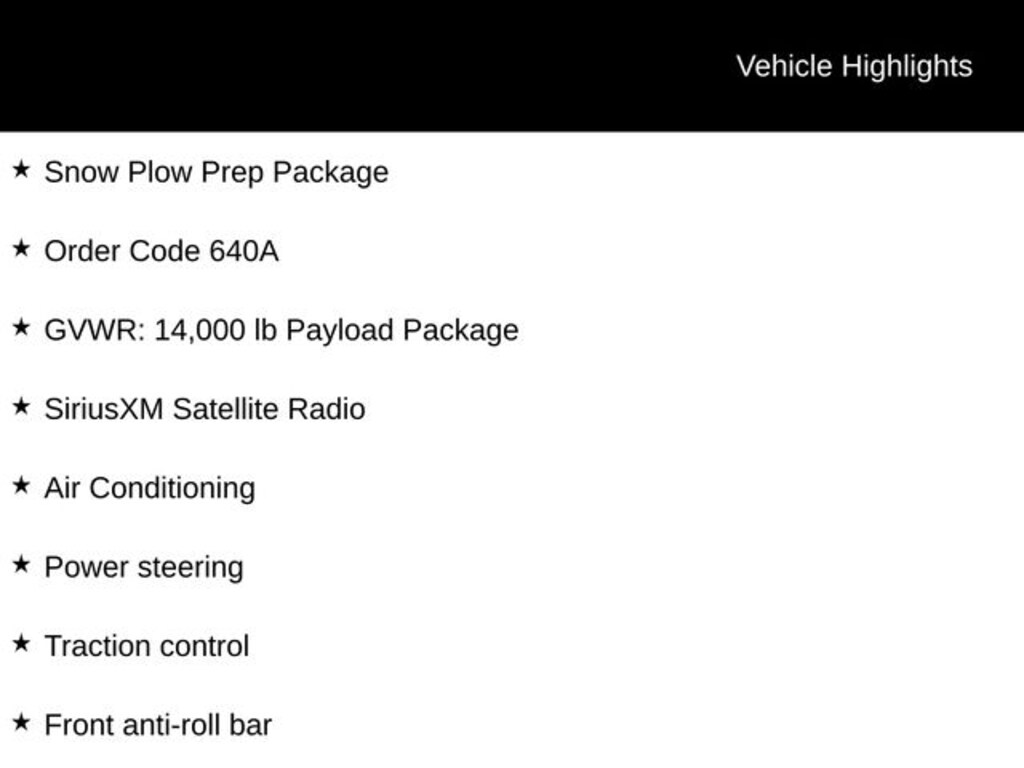 4WD, 4-Wheel Disc Brakes, ABS brakes, Air Conditioning, Center High-Mounted Stop Lamp (CHMSL), Dual front impact airbags, Dual front side impact airbags, Dual rear wheels, Front anti-roll bar, Front reading lights, GVWR: 14,000 lb Payload Package, Low tire pressure warning, Order Code 640A, Outside temperature display, Overhead airbag, Overhead console, Passenger vanity mirror, Platform Running Boards, Power steering, Rear reading lights, SiriusXM Satellite Radio, Snow Plow Prep Package, Split folding rear seat, Tachometer, Telescoping steering wheel, Tilt steering wheel, Traction control, Trip computer.
