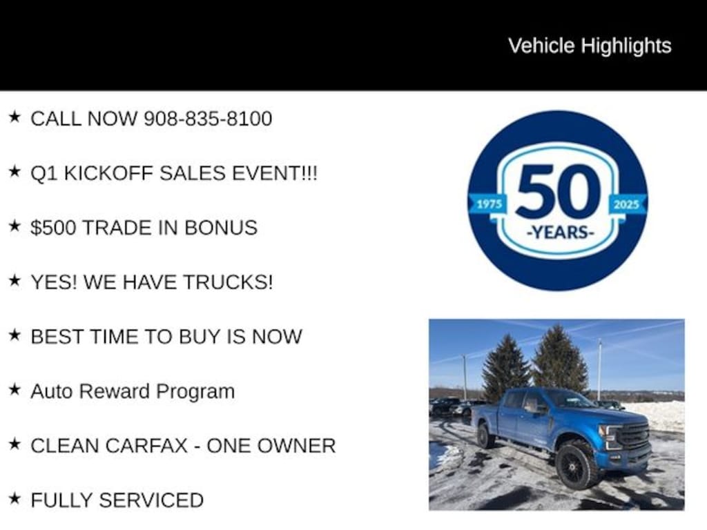 Whether you're tackling tough jobs or seeking uncompromising luxury, this 2021 Ford F-250SD Lariat is the perfect choice. Call us now at 908-835-8100 to schedule a test drive and experience the power and refinement of this exceptional truck for yourself.