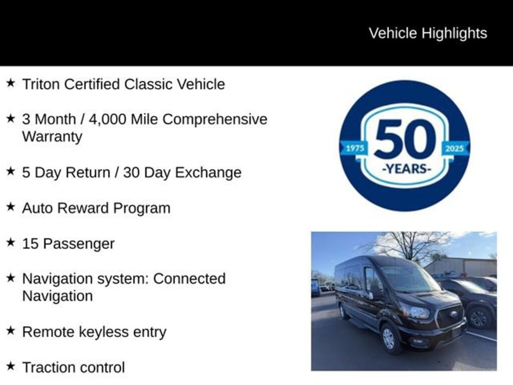 Discover the ultimate in versatility and capability with the 2023 Ford Transit-350 XLT. This remarkable van is the perfect companion for your growing business or family needs, offering unparalleled functionality and a host of premium features that will elevate your driving experience. 15-Passenger Seating 360-Degree Camera with Split View Privacy Glass Running Boards AM/FM Stereo with SYNC 4, SiriusXM, and NavigationDesigned to handle any task with ease, the Transit-350 XLT boasts a powerful 3.5L V6 Flex Fuel engine paired with a smooth-shifting 10-Speed Automatic transmission. With its rear-wheel-drive configuration and impressive GVWR of 9,400 lbs, this van is ready to tackle any challenge you throw its way.The Triton Certified Classic Vehicle designation means this Transit-350 XLT has been meticulously inspected and comes with a comprehensive 3-month/4,000-mile warranty, ensuring your peace of mind. Additionally, you'll enjoy the benefits of our 5-Day Return/30-Day Exchange policy and the Auto Reward Program, providing you with added confidence and value.Slip behind the wheel of this stunning Black exterior and experience the unparalleled comfort and convenience of the Dark Palazzo Gray Cloth Bucket Seats. Enjoy the convenience of the 12-inch multi-function display, embedded voice recognition, and the seamless integration of your favorite technologies through the SYNC 4 system.Safety is a top priority, and the Transit-350 XLT delivers with features like ABS brakes, Electronic Stability Control, Traction Control, and a comprehensive airbag system. The Reverse Sensing System and Front Sensing System provide added confidence when navigating tight spaces, while the Auto High-Beam Headlights and Rain-Sensing Wipers ensure optimal visibility in any driving conditions.Whether you're transporting a large crew, hauling heavy equipment, or embarking on a family adventure, the 2023 Ford Transit-350 XLT is the ultimate solution. Experience the unparalleled capability and premium features that make this van a true standout in its class. Visit our showroom today and let us demonstrate how this exceptional vehicle can transform the way you work and play.