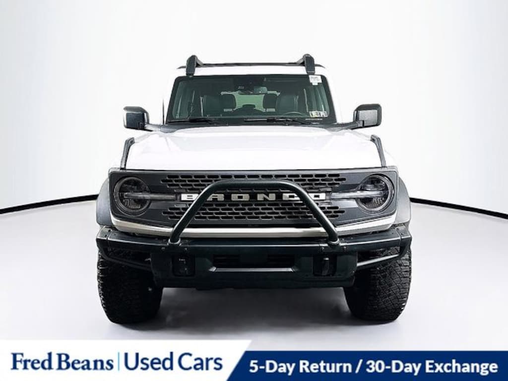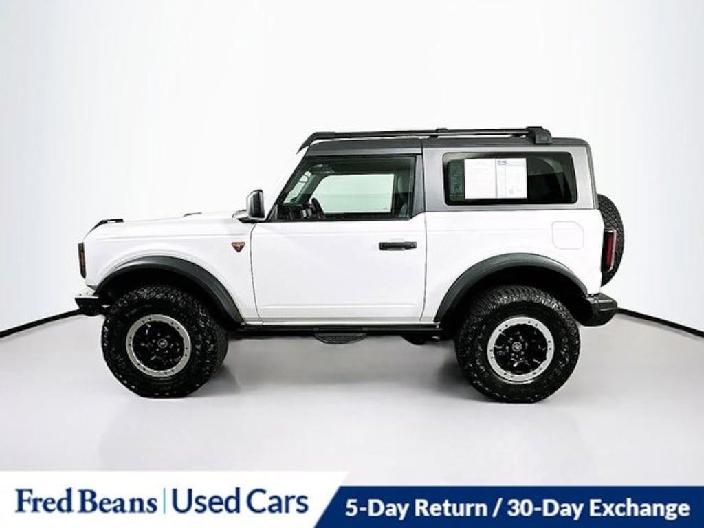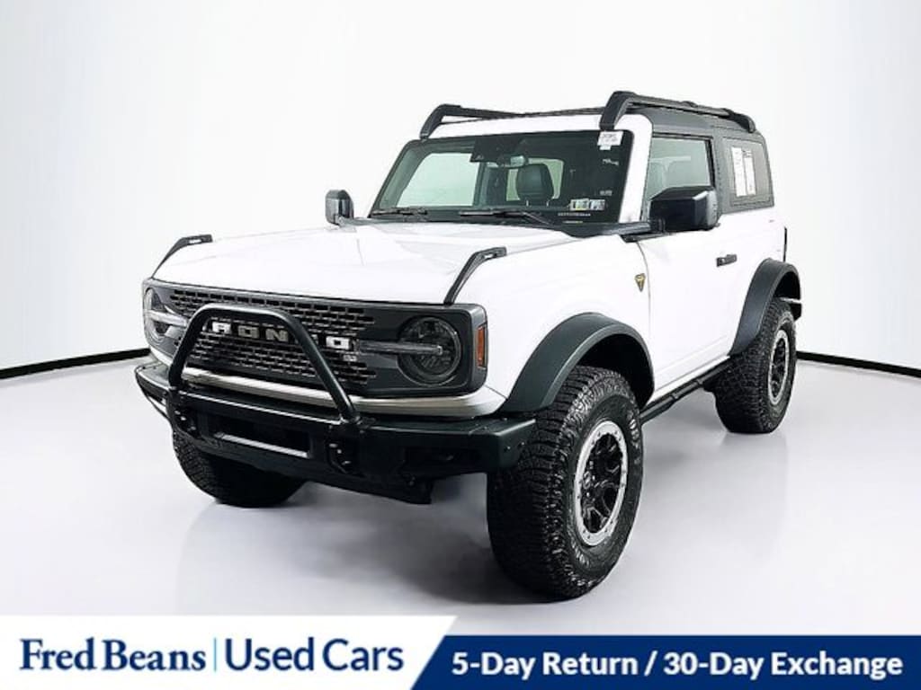 2024 Ford Bronco Badlands in Oxford White, powered by a 2.7L EcoBoost V6 with a 10-speed automatic transmission and 4WD. This 2-door SUV was bought and serviced right here at Fred Beans and comes with a strong service history, local trade, and the remainder of its factory warranty. Equipped with the Sasquatch Package, high-clearance suspension and fender flares, position-sensitive Bilstein shocks, trailer tow package, and convertible hardtop, this Bronco is ready for any adventure. Comfort and convenience features include heated front bucket seats, dual-zone automatic climate control, LED headlamps, BLIS blind spot system, rear parking sensors, Connected Navigation, remote start, SiriusXM with 360L, and 17" black gloss-painted aluminum wheels.