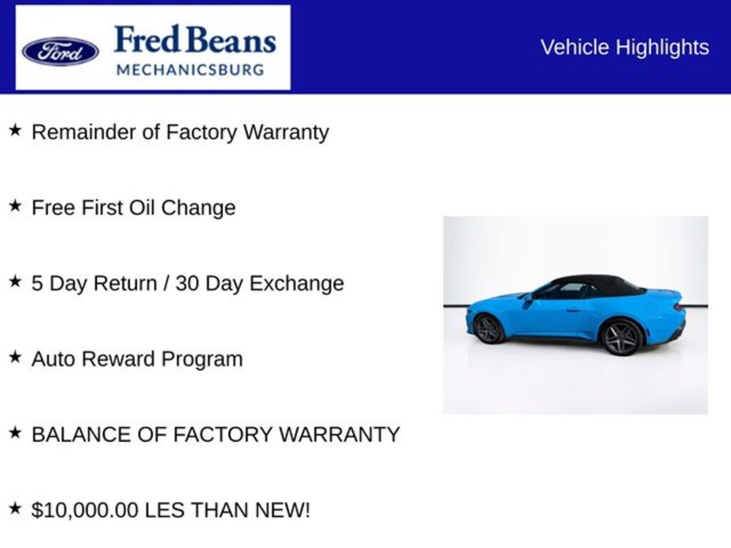 2024 Ford Mustang EcoBoost Premium EcoBoost 2.3L I4 GTDi DOHC Turbocharged VCT 10-Speed Automatic RWD 2D Convertible Grabber Blue Metallic Remainder of Factory Warranty, Free First Oil Change, 5 Day Return / 30 Day Exchange, Auto Reward Program, 4-Wheel Disc Brakes, 9 Speakers, ABS brakes, Active Valve Performance Exhaust, Air Conditioning, Alloy wheels, AM/FM radio: SiriusXM with 360L, AM/FM Stereo, Auto High-beam Headlights, Automatic temperature control, Brake assist, Bumpers: body-color, Compass, Convertible roof lining, Delay-off headlights, Driver door bin, Driver vanity mirror, Dual front impact airbags, Dual front side impact airbags, Electronic Stability Control, Emergency communication system: 911 Assist, Exterior Parking Camera Rear, Four wheel independent suspension, Front anti-roll bar, Front Bucket Seats, Front Center Armrest, Front dual zone A/C, Front reading lights, Fully automatic headlights, Glass rear window, Heated front seats, Illuminated entry, Knee airbag, Leather Shift Knob, Low tire pressure warning, Occupant sensing airbag, Outside temperature display, Overhead console, Panic alarm, Passenger door bin, Passenger vanity mirror, Power convertible roof, Power door mirrors, Power driver seat, Power steering, Power windows, Radio data system, Rain sensing wipers, Rear anti-roll bar, Rear Parking Sensors, Rear window defroster, Remote keyless entry, Security system, Speed control, Speed-sensing steering, Speed-Sensitive Wipers, Sport steering wheel, Steering wheel mounted audio controls, SYNC 4.0 QNX, Tachometer, Telescoping steering wheel, Tilt steering wheel, Traction control, Trip computer, Variably intermittent wipers, Voltmeter, Wheels: 18" x 8" Machined-Face Aluminum, Wheels: 19" x 8.5" Premier Polished Aluminum, BALANCE OF FACTORY WARRANTY, $10,000.00 LES THAN NEW!.