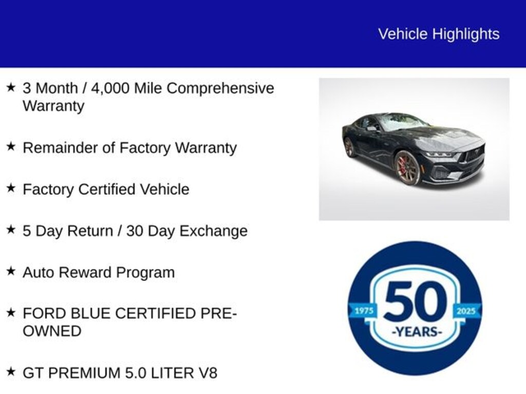 This exceptional Mustang GT Premium also comes with the remainder of the factory warranty, ensuring you can enjoy the thrill of ownership with confidence. Whether you're seeking a daily driver with uncompromising performance or a head-turning weekend warrior, this 2024 Ford Mustang GT Premium is the perfect choice.