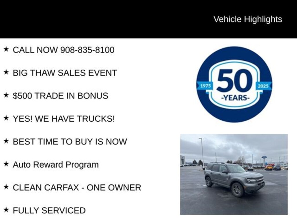 Don't miss your chance to experience the ultimate in off-road capability and on-road refinement. Call us now at 908-835-8100 to schedule a test drive and discover why the 2025 Ford Bronco Sport Big Bend is the perfect choice for your next adventure.