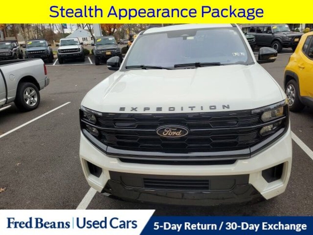 Recent Arrival! 2025 Ford Expedition Max Platinum EcoBoost 3.5L V6 GTDi DOHC 24V Twin Turbocharged 10-Speed Automatic 4WD 4D Sport Utility Star White Metallic Tri-Coat Local Trade, 2nd Row Power-Folding Captain's Chairs, Adjustable pedals, AM/FM radio: SiriusXM with 360L, Apple CarPlay/Android Auto, Automatic temperature control, Black Belt Molding, Black Expedition Lettering On Hood, Black Headlamp Bezel w/Ebony Trim Applique, Black Platinum Badge On Tailgate, Black Roof Rails, Carbon Black Front Bumper/Fascia, Connectivity Package (One-Time Purchase), Engine Sound Enhancer, Equipment Group 600A Standard Package, Exterior Parking Camera Rear, Front dual zone A/C, Garage door transmitter, Heated & Ventilated Leather Front Captain's Chairs, Heated door mirrors, Heated rear seats, Heated steering wheel, Memory seat, Pedal memory, Power door mirrors, Power driver seat, Power moonroof: Vista Roof, Power passenger seat, Power windows, Radio: B&O Sound System by Bang & Olufsen, Rain sensing wipers, Rear air conditioning, Rear Side Windows Laminated Glass, Rear window defroster, Remote keyless entry, Signature Grille Lighting, SiriusXM w/360L, Stealth Appearance Package, Turn signal indicator mirrors, Wheels: 22" Ebony Painted Aluminum.