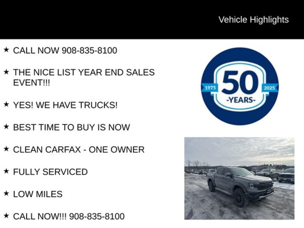 CALL NOW 908-835-8100, THE NICE LIST YEAR END SALES EVENT!!!, YES! WE HAVE TRUCKS!, BEST TIME TO BUY IS NOW, CLEAN CARFAX - ONE OWNER, FULLY SERVICED, LOW MILES, CALL NOW!!! 908-835-8100, Remainder of Factory Warranty, 5 Day Return / 30 Day Exchange, Auto Reward Program, 4WD, Internet access capable: FordPass Connect 4G, Navigation system: Connected Navigation, Security system, Tough Bed Spray-In Bedliner. Recent Arrival! 2025 Ford Ranger Raptor 3.0L EcoBoost V6 10-Speed Automatic 4WD 4D Crew Cab Gray Metallic
