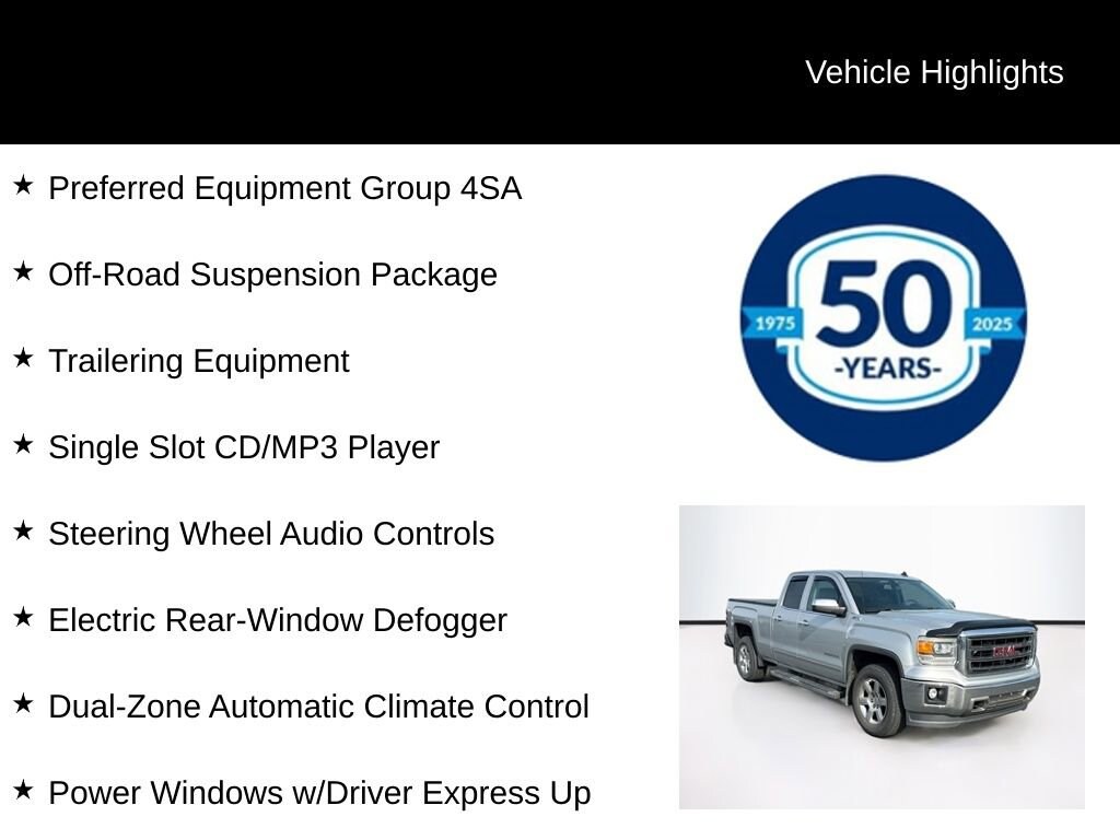This 2014 GMC Sierra 1500 SLT is a rugged and well-equipped pickup that's ready to take on your toughest tasks. Boasting a powerful EcoTec3 5.3L V8 engine and capable 4WD system, this Sierra delivers impressive performance and off-road prowess.Key features include:- Leather-appointed heated front bucket seats with 10-way power adjustability and driver's memory- Tilt-and-telescoping steering column- All-terrain tires and off-road suspension package- Remote vehicle starter system and universal home remote- EZ Lift & Lower tailgate- Rear vision camera with dynamic guide lines- Bose premium audio system with 8 color touch screenInside, the spacious cabin offers dual-zone automatic climate control, a 110-volt power outlet, and a 4.2 diagonal color driver information center. The Sierra's rugged good looks are enhanced by chrome exterior accents, including the grille surround, door handles, and tubular assist steps.Whether you're hauling heavy loads, navigating rough terrain, or just enjoying a comfortable daily driving experience, this 2014 GMC Sierra 1500 SLT is a premium full-size pickup built to handle it all. With its impressive capabilities, thoughtful amenities, and handsome styling, this Sierra is sure to impress. We welcome you to visit our showroom and experience it for yourself.This well-equipped Sierra is ready to take your adventures to new heights. With its powerful EcoTec3 V8, capable 4WD system, and premium interior features, it's the complete package for work and play. We invite you to schedule a test drive and see how this Sierra can elevate your driving experience.