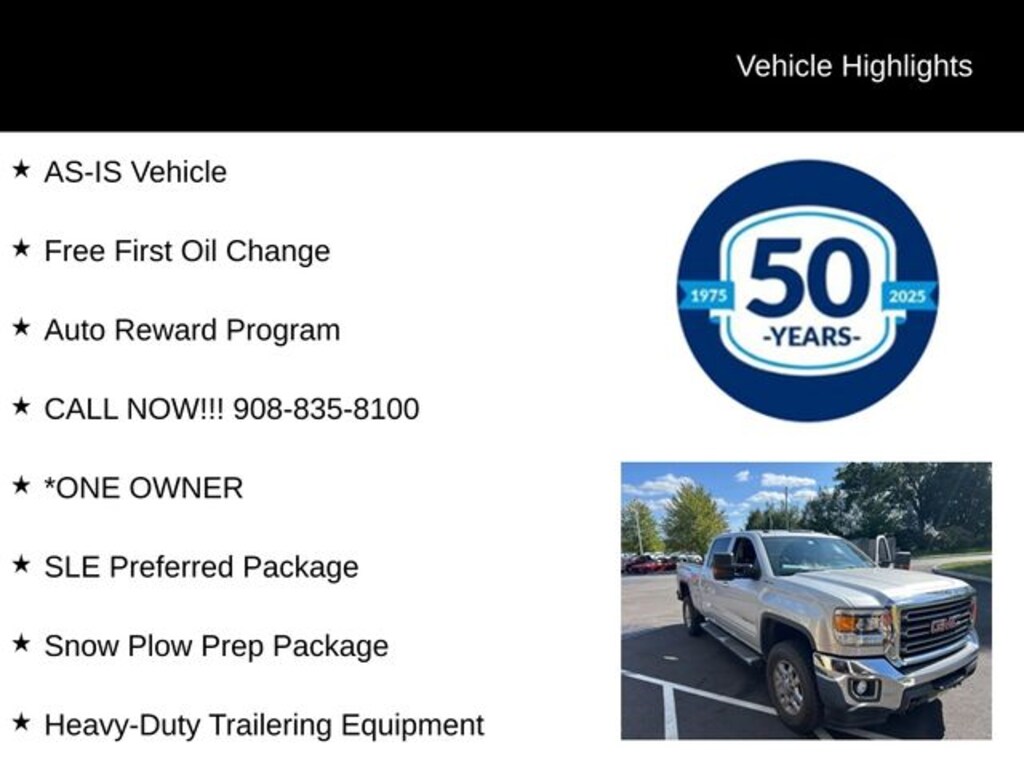 New Price! Recent Arrival! 2015 GMC Sierra 2500HD SLE Vortec 6.0L V8 SFI Flex Fuel VVT 6-Speed Automatic HD Electronic with Overdrive 4WD 4D Crew Cab Quicksilver Metallic AS-IS Vehicle, Free First Oil Change, Auto Reward Program, CALL NOW!!! 908-835-8100, *ONE OWNER, 6-Speed Automatic HD Electronic with Overdrive, 4WD, Black Cloth, 10-Way Power Driver's Seat Adjuster, 110-Volt AC Power Outlet, 18" Polished Aluminum Wheels, 220 Amps Alternator, 4-Wheel Disc Brakes, 4.10 Rear Axle Ratio, 4.2" Diagonal Color Display Driver Info Center, 6 Speakers, 6" Rectangular Chrome Tubular Assist Steps (LPO), ABS brakes, Air Conditioning, Alloy wheels, AM/FM radio: SiriusXM, Auto-Dimming Inside Rear-View Mirror, Bluetooth® For Phone, Body Color Bodyside Moldings, Body-Color Door Handles, Body-Color Mirror Caps, Body-Color Power-Adjustable Heated Outside Mirrors, Bodyside moldings, Brake assist, Bumpers: chrome, CD player, Chrome Front Bumper, Chrome Rear Bumper, Cloth Seat Trim, Color-Keyed Carpeting Floor Covering, Compass, Deep-Tinted Glass, Delay-off headlights, Driver & Front Passenger Visors, Driver door bin, Driver vanity mirror, Dual front impact airbags, Dual front side impact airbags, Dual-Zone Automatic Climate Control, Electric Rear-Window Defogger, Electronic Shift Transfer Case, Electronic Stability Control, Emergency communication system: OnStar Directions & Connections, Exterior Parking Camera Rear, EZ-Lift & Lower Tailgate, Front 40/20/40 Reclining Split-Bench Seat, Front anti-roll bar, Front Center Armrest w/Storage, Front Halogen Fog Lamps, Front reading lights, Front wheel independent suspension, Fully automatic headlights, Heated door mirrors, Heated Driver & Front Passenger Seats, Heavy-Duty Trailering Equipment, Illuminated entry, Leather-Wrapped Steering Wheel, LED Cargo Box Lighting, Low tire pressure warning, Manual Tilt-Wheel/Telescoping Steering Column, Occupant sensing airbag, OnStar 4G LTE Wi-Fi Hotspot, OnStar 6 Months Directions/Connections Plan, Outside temperature display, Overhead airbag, Overhead console, Panic alarm, Passenger door bin, Passenger vanity mirror, Power door mirrors, Power steering, Power windows, Power Windows w/Driver Express Up & Down, Power-Adjustable Black Heated Outside Mirrors, Provision for Cab Roof-Mounted Lamp/Beacon, Radio: AM/FM/SiriusXM, Radio: AM/FM/SiriusXM w/Navigation, Rear 60/40 Folding Bench Seat (Folds Up), Rear Bumper Cornersteps, Rear reading lights, Rear seat center armrest, Rear step bumper, Rear Vision Camera w/Dynamic Guide Lines, Rear Wheelhouse Liners, Remote Keyless Entry, Remote keyless entry, Remote Vehicle Starter System, Single Slot CD/MP3 Player, SiriusXM Satellite Radio, SLE Decor, SLE Preferred Package, Smoked Amber Roof Marker Lamps, Snow Plow Prep Package, Speed control, Split folding rear seat, Standard Suspension Package, Steering Wheel Audio Controls, Steering wheel mounted audio controls, Tachometer, Theft Deterrent System (Unauthorized Entry), Tilt steering wheel, Traction control, Trip computer, Universal Home Remote, Variably intermittent wipers, Voltmeter.