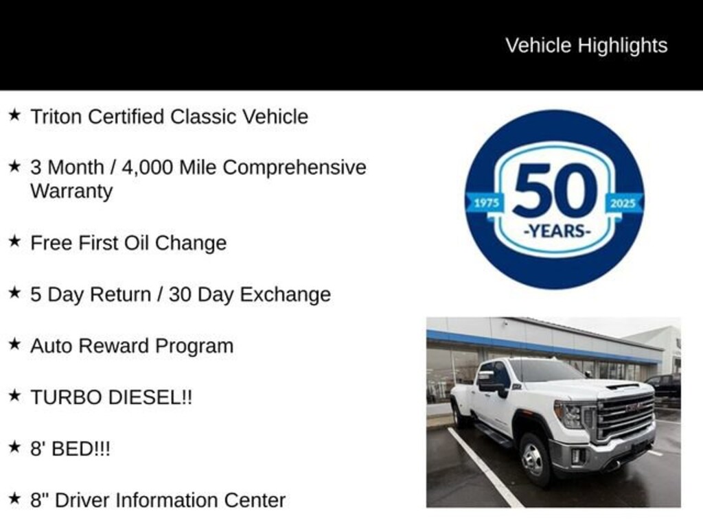 CARFAX One-Owner.Recent Arrival! 2020 GMC Sierra 3500HD SLT Duramax 6.6L V8 Turbodiesel 10-Speed Automatic 4WD 4D Crew Cab White Frost Tricoat Triton Certified Classic Vehicle, 3 Month / 4,000 Mile Comprehensive Warranty, Free First Oil Change, 5 Day Return / 30 Day Exchange, Auto Reward Program, TURBO DIESEL!!, 8' BED!!!, 10-Speed Automatic, 4WD, Jet Black Leather, 8 Driver Information Center, Apple CarPlay/Android Auto.Odometer is 46861 miles below market average!Certified. Certification Program Details: Triton Certified Shield Classic 3-Month or 4,000-Mile Comprehensive Coverage ($100 deductible) 100+ Multipoint Inspection PA State Inspection & Emissions Test Oil, Lube, & Filter Service Completed 5-Day Return Policy1 30-Day Exchange Policy2 CARFAXTM Report AutoRewards Membership See salesperson for additional offers & complete details.For better peace of mind all our used vehicles have a 127-point inspection and come with a 5-day return, 30-day exchange (As-Is vehicles are excluded). Our exclusive Auto Rewards Program provides better value with Free First Oil change, Free Pa State Safety inspections, discounts for local merchants and more. Plus, you can earn up to $2000 towards your next vehicle just by servicing with Fred Beans! As Fred Beans always says, our used cars are better because our reputation depends on it.Although every reasonable effort has been made to ensure the accuracy of the information contained on this site, absolute accuracy cannot be guaranteed. This site, and all information and materials appearing on it, are presented to the user as is without warranty of any kind, either express or implied. All vehicles are subject to prior sale. Price does not include applicable tax, title, license, processing and/or documentation fees. Vehicles shown at different locations are not currently in our inventory (Not in Stock) but can be made available to you at our location within a reasonable date from the time of your request, not to exceed one week. Residency restrictions may apply.