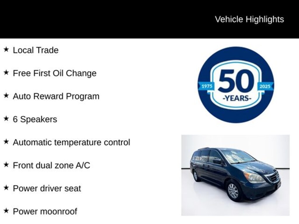 2010 Honda Odyssey EX-L 3.5L V6 SOHC i-VTEC 24V 5-Speed Automatic with Overdrive FWD 4D Passenger Van Bali Blue Pearl Local Trade, Free First Oil Change, Auto Reward Program, 6 Speakers, Automatic temperature control, Front dual zone A/C, Heated front seats, Leather Seat Trim, Leather steering wheel, Power driver seat, Power Liftgate, Power moonroof, Reclining 3rd row seat, 16" Alloy Wheels, 3rd row seats: split-bench, 4-Wheel Disc Brakes, 4.312 Axle Ratio, ABS brakes, Air Conditioning, Alloy wheels, AM/FM radio: XM, AM/FM/6-Disc In-Dash Audio System, Anti-whiplash front head restraints, Auto-dimming Rear-View mirror, Bodyside moldings, Brake assist, Bumpers: body-color, CD player, Delay-off headlights, Driver door bin, Driver vanity mirror, Driver's Seat Mounted Armrest, Dual front impact airbags, Dual front side impact airbags, Electronic Stability Control, Four wheel independent suspension, Front anti-roll bar, Front Bucket Seats, Front reading lights, Garage door transmitter: HomeLink(R), Heated door mirrors, Heated Front Bucket Seats, Illuminated entry, Leather Shift Knob, Low tire pressure warning, Occupant sensing airbag, Outside temperature display, Overhead airbag, Overhead console, Panic alarm, Passenger door bin, Passenger seat mounted armrest, Passenger vanity mirror, Power door mirrors, Power passenger seat, Power steering, Power windows, Rear air conditioning, Rear reading lights, Rear window defroster, Rear window wiper, Remote keyless entry, Roof rack: rails only, Security system, Speed control, Speed-sensing steering, Speed-Sensitive Wipers, Split folding rear seat, Spoiler, Steering wheel mounted audio controls, Tachometer, Telescoping steering wheel, Tilt steering wheel, Traction control, Variably intermittent wipers, XM Radio, 6 Speakers, Automatic temperature control, Front dual zone A/C, Heated front seats, Leather Seat Trim, Leather steering wheel, Power driver seat, Power Liftgate, Power moonroof, Reclining 3rd row seat.