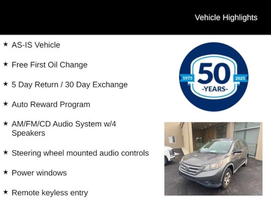 This 2013 Honda CR-V LX is an exceptional value, offered to you as-is with a free first oil change. Take advantage of our 5-Day Return/30-Day Exchange policy, and experience the confidence and convenience of owning this versatile and well-equipped SUV. Visit our showroom today and let us help you discover the perfect vehicle to fit your lifestyle.