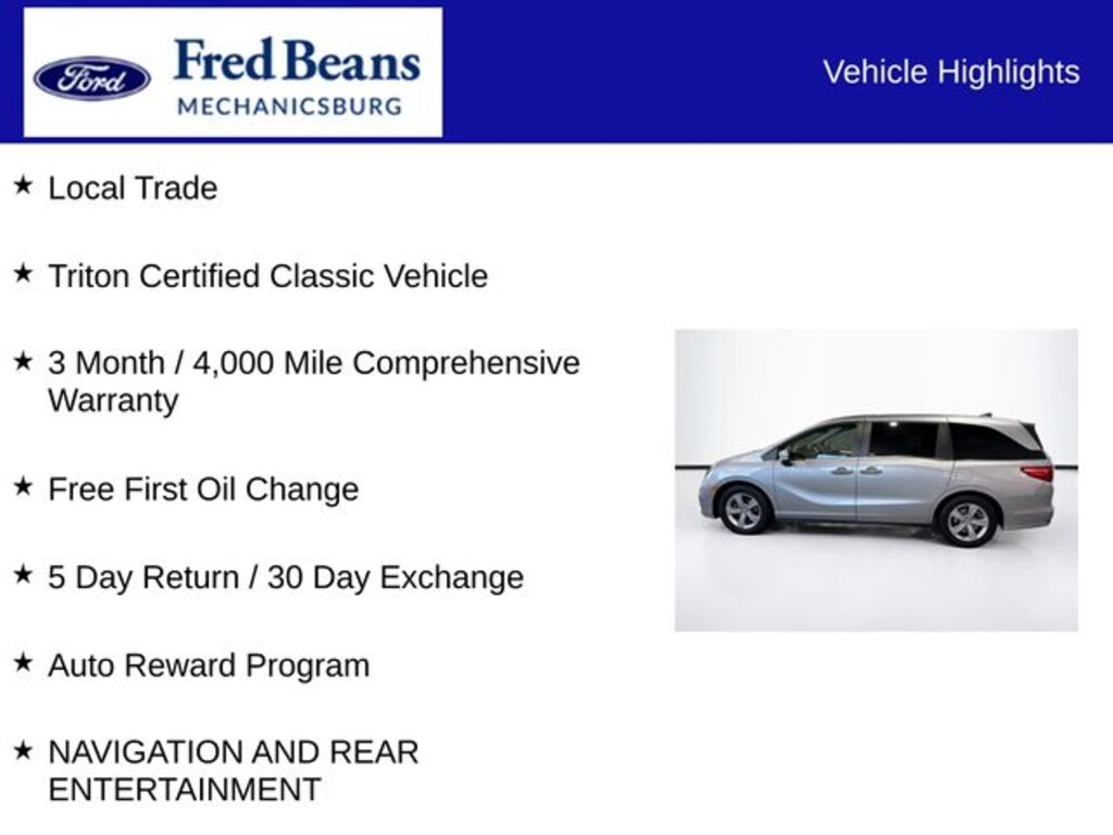 2019 Honda Odyssey EX-L 3.5L V6 SOHC i-VTEC 24V 9-Speed Automatic FWD 4D Passenger Van Pacific Pewter Metallic Local Trade, Triton Certified Classic Vehicle, 3 Month / 4,000 Mile Comprehensive Warranty, Free First Oil Change, 5 Day Return / 30 Day Exchange, Auto Reward Program, Navigation System, 3rd row seats: split-bench, 4-Wheel Disc Brakes, 4.33 Axle Ratio, 7 Speakers, A/V remote: CabinControl, ABS brakes, Air Conditioning, Alloy wheels, AM/FM radio: SiriusXM, Anti-whiplash front head restraints, Apple CarPlay/Android Auto, Auto High-beam Headlights, Auto-dimming Rear-View mirror, Automatic temperature control, Blind Spot Information (BSI) System warning, Brake assist, Bumpers: body-color, Delay-off headlights, Driver door bin, Driver vanity mirror, Driver's Seat Mounted Armrest, Dual front impact airbags, Dual front side impact airbags, Electronic Stability Control, Emergency communication system: HondaLink, Exterior Parking Camera Rear, Forward collision: Collision Mitigation Braking System (CMBS) + FCW mitigation, Four wheel independent suspension, Front anti-roll bar, Front Bucket Seats, Front dual zone A/C, Front fog lights, Front reading lights, Fully automatic headlights, Garage door transmitter: HomeLink, Heated door mirrors, Heated Front Bucket Seats, Heated front seats, Illuminated entry, Knee airbag, Lane departure: Lane Keeping Assist System (LKAS) active, Leather Seat Trim, Leather steering wheel, Low tire pressure warning, Memory seat, Occupant sensing airbag, Outside temperature display, Overhead airbag, Overhead console, Panic alarm, Passenger door bin, Passenger seat mounted armrest, Passenger vanity mirror, Power door mirrors, Power driver seat, Power Liftgate, Power moonroof, Power passenger seat, Power steering, Power windows, Radio data system, Radio: 160-Watt AM/FM/HD/SiriusXM Audio System, Rear air conditioning, Rear anti-roll bar, Rear reading lights, Rear seat center armrest, Rear window defroster, Rear window wiper, Reclining 3rd row seat, Remote keyless entry, Security system, Speed control, Speed-sensing steering, Speed-Sensitive Wipers, Split folding rear seat, Spoiler, Steering wheel mounted audio controls, Tachometer, Telescoping steering wheel, Tilt steering wheel, Traction control, Trip computer, Turn signal indicator mirrors, Variably intermittent wipers, Wheels: 18" Dark Silver-Painted Alloy, NAVIGATION AND REAR ENTERTAINMENT, Navigation System.
