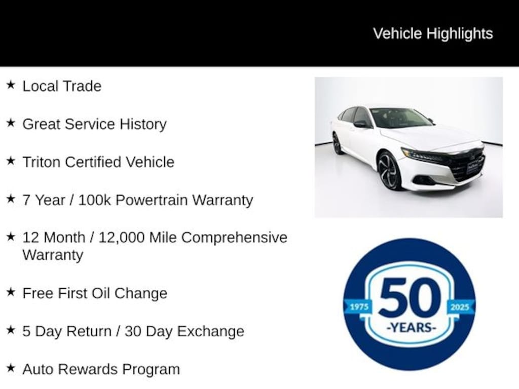 2021 Honda Accord Sport Special Edition Sport Special Edition 1.5T I4 DOHC 16V Turbocharged VTEC CVT FWD 4D Sedan White Local Trade, Great Service History, Triton Certified Vehicle, 7 Year / 100k Powertrain Warranty, 12 Month / 12,000 Mile Comprehensive Warranty, Free First Oil Change, 5 Day Return / 30 Day Exchange, Auto Rewards Program, Black Leather, Adaptive Cruise Control: Adaptive Cruise Control (ACC) with Low-Speed Follow, Apple CarPlay/Android Auto, Automatic temperature control, Brake assist, Electronic Stability Control, Forward collision: Collision Mitigation Braking System (CMBS) + FCW mitigation, Front dual zone A/C, Front fog lights, Fully automatic headlights, Heated door mirrors, Heated Front Bucket Seats, Lane Departure Warning System, Leather-Trimmed Seats, Power driver seat, Power passenger seat, Radio: 180-Watt AM/FM Audio System, Remote keyless entry, Security system, Split folding rear seat, Spoiler, Steering wheel mounted audio controls, Wheels: 19" Machine-Finished Alloy w/Black Inserts.