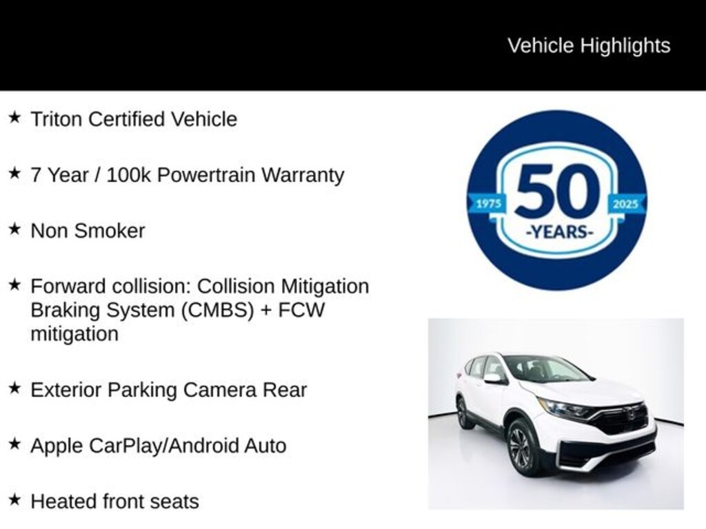 2022 Honda CR-V Special Edition 1.5L I4 DOHC 16V CVT AWD 4D Sport Utility White Triton Certified Vehicle, 7 Year / 100k Powertrain Warranty, Non Smoker, AWD, Apple CarPlay/Android Auto, Exterior Parking Camera Rear, Forward collision: Collision Mitigation Braking System (CMBS) + FCW mitigation, Heated front seats.