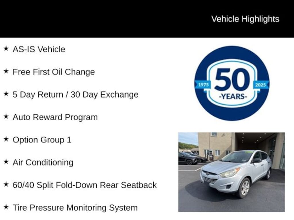 Recent Arrival! 2012 Hyundai Tucson GL Theta 2.0L 4-Cylinder MPI DOHC 16V CVVT 6-Speed Automatic with Overdrive FWD 4D Sport Utility Diamond Silver AS-IS Vehicle, Free First Oil Change, 5 Day Return / 30 Day Exchange, Auto Reward Program, 4-Wheel Disc Brakes w/ABS, 4-Wheel Independent Suspension, 60/40 Split Fold-Down Rear Seatback, Active Front Head Restraints, Advanced Front Airbags, Air Conditioning, Body-Color Rear Spoiler w/LED Lights, Bottle Holder (4 Doors), Electronic Stability Control w/Traction Control System, EZ Lane Change Assist, Front & Cargo Area Power Outlets, Hillstart Assist Control (HAC), Interior Metal Paint & Black High-Gloss Accents, Motor Driven Power Steering, Multi-Function Trip Computer, Option Group 1, Power Door Locks, Power Mirrors, Power Windows, Rear Armrest w/Cupholders, Rear Privacy Glass, Rear Wiper w/Washer, Remote Keyless Entry System w/Alarm, Solar Front Glass, Tilt Steering Wheel, Tire Pressure Monitoring System, Variable Intermittent Front Windshield Wiper.
