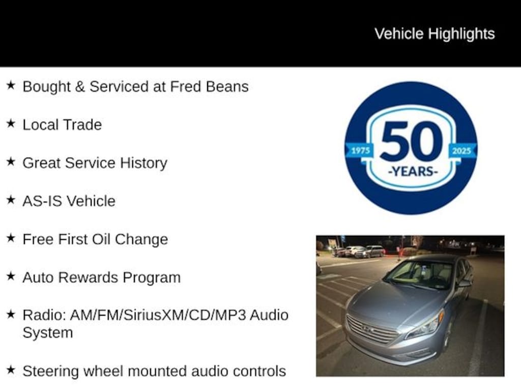 Recent Arrival! 2015 Hyundai Sonata SE SE 2.4L I4 DGI DOHC 16V PZEV 185hp 6-Speed Automatic with Shiftronic FWD 4D Sedan Shale Gray Metallic Bought & Serviced at Fred Beans, Local Trade, Great Service History, AS-IS Vehicle, Free First Oil Change, Auto Rewards Program, Gray Cloth, Alloy wheels, Delay-off headlights, Four wheel independent suspension, Front Bucket Seats, Heated door mirrors, Illuminated entry, Power door mirrors, Premium Cloth Seating Surfaces, Radio: AM/FM/SiriusXM/CD/MP3 Audio System, Rear Bumper Applique, Remote keyless entry, Steering wheel mounted audio controls.
