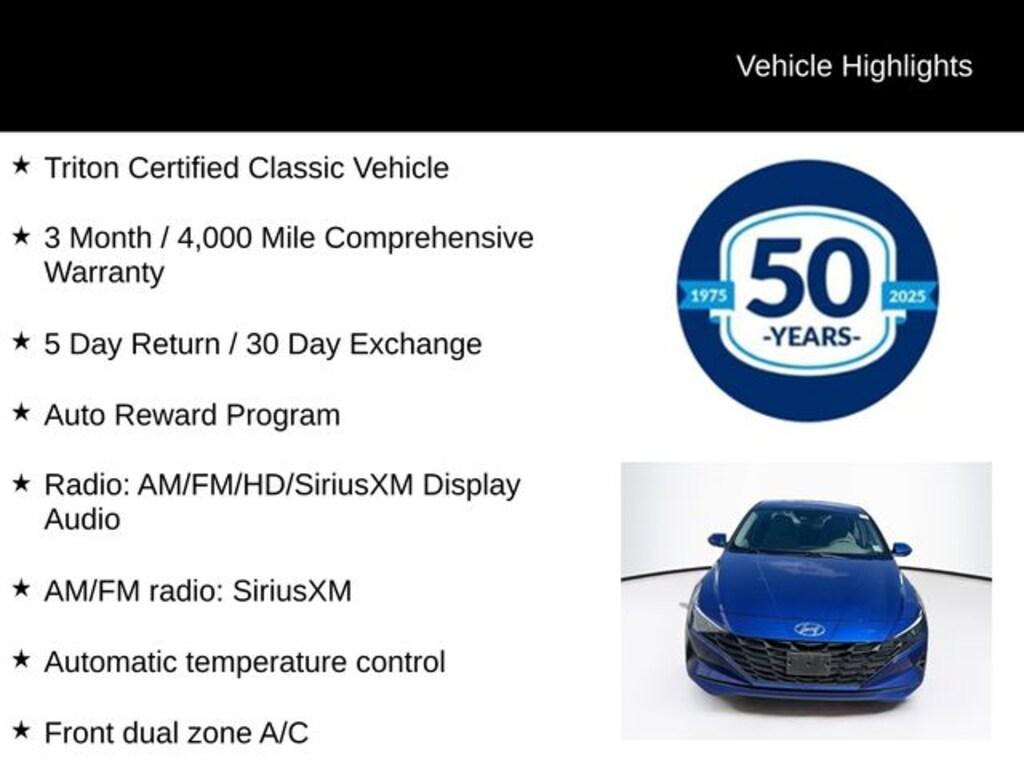 Recent Arrival! 2022 Hyundai Elantra SEL 2.0L 4-Cylinder DOHC 16V CVT FWD 4D Sedan Intense Blue Triton Certified Classic Vehicle, 3 Month / 4,000 Mile Comprehensive Warranty, 5 Day Return / 30 Day Exchange, Auto Reward Program, AM/FM radio: SiriusXM, Apple CarPlay & Android Auto, Auto High-beam Headlights, Automatic temperature control, Exterior Parking Camera Rear, Front dual zone A/C, Fully automatic headlights, Power door mirrors, Power windows, Radio: AM/FM/HD/SiriusXM Display Audio, Remote keyless entry.