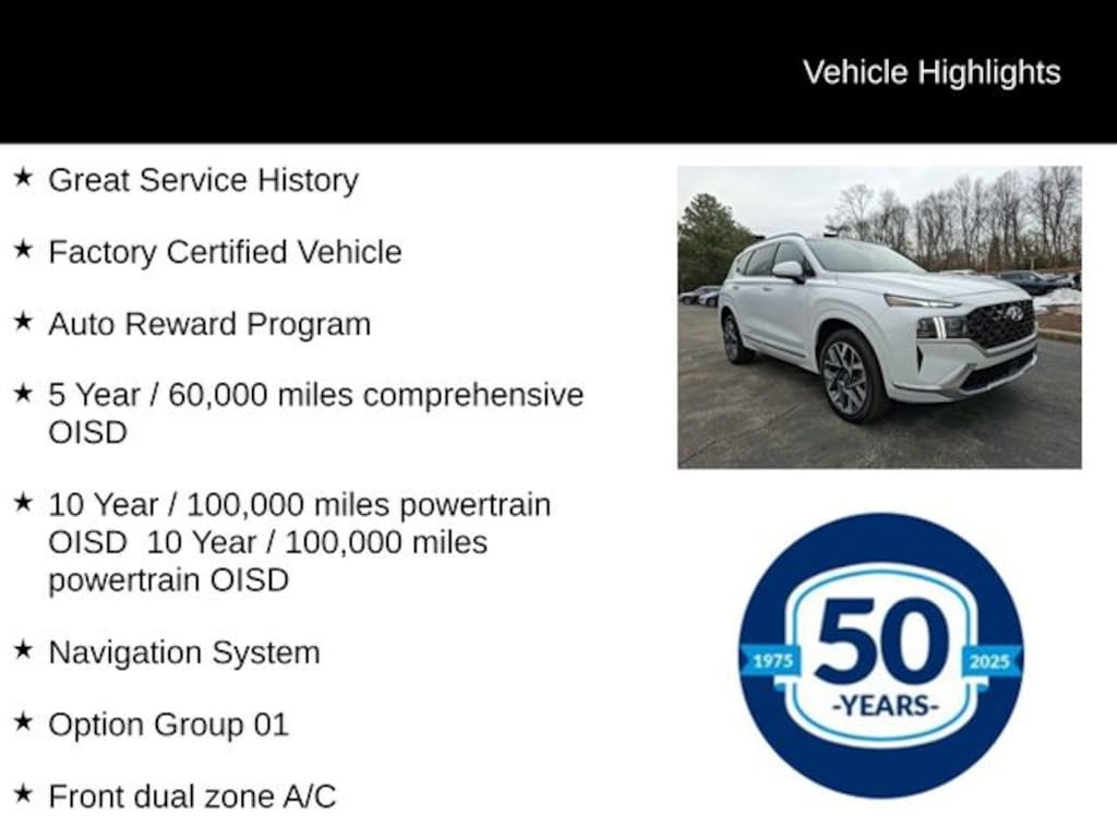 For your peace of mind, this Hyundai Santa Fe Calligraphy comes with an exceptional Certified Pre-Owned warranty and protection plan. Enjoy the confidence of a 173+ Point Inspection, Roadside Assistance, a $50 Warranty Deductible, and a comprehensive Vehicle History report.