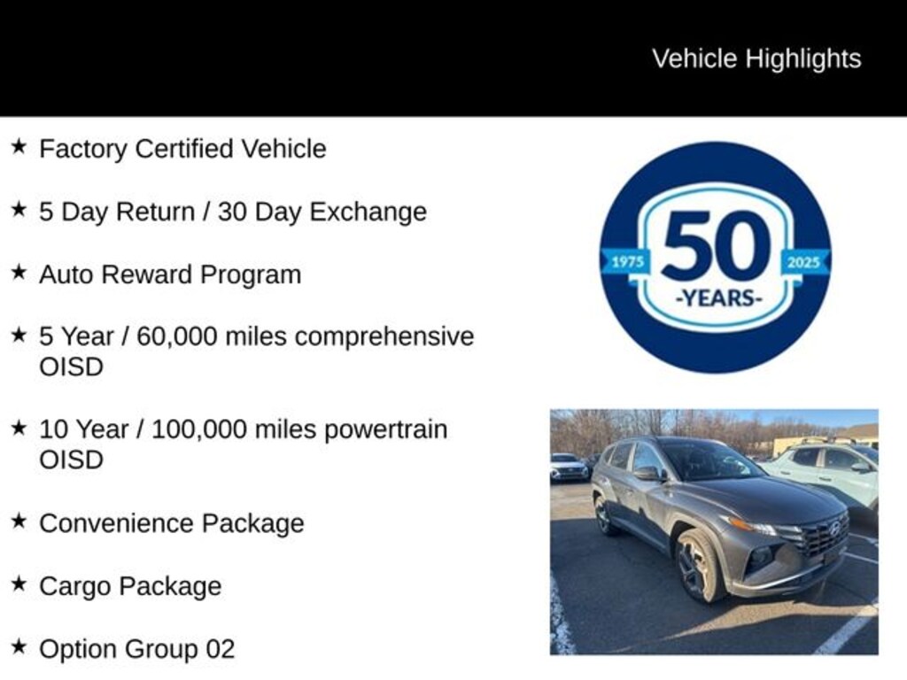 Powered by a 2.5L I4 DGI DOHC 16V engine paired with an 8-Speed Automatic transmission, this Tucson SEL delivers an impressive 24 city / 29 highway MPG, ensuring you can go the distance without sacrificing efficiency.