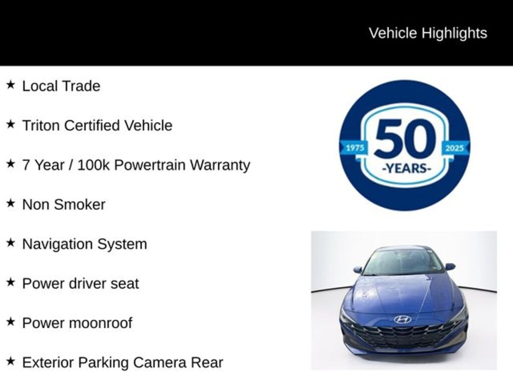 Recent Arrival! 2023 Hyundai Elantra Limited I4 CVT FWD 4D Sedan Intense Blue Local Trade, Triton Certified Vehicle, 7 Year / 100k Powertrain Warranty, Non Smoker, Apple CarPlay & Android Auto, Exterior Parking Camera Rear, Fully automatic headlights, Heated Front Seats, Navigation System, Power driver seat, Power moonroof.