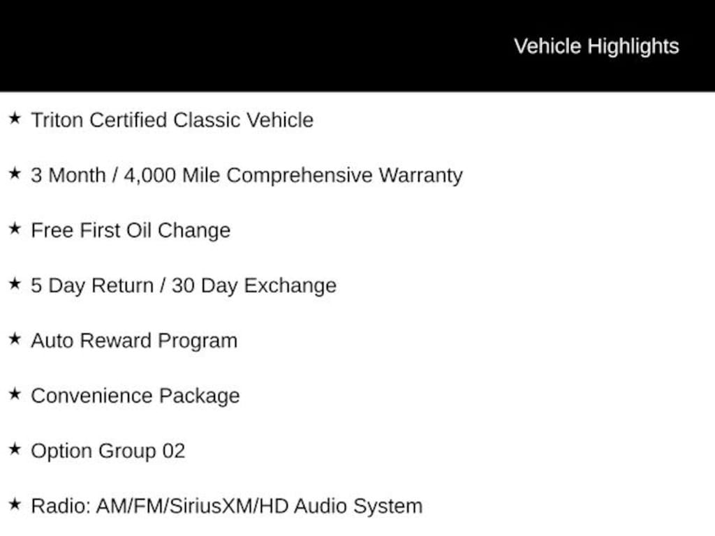 This Triton Certified Classic Vehicle comes with a comprehensive 3-month/4,000-mile warranty, providing you with peace of mind and assurance. Additionally, you'll receive a free first oil change and the opportunity to take advantage of our 5-day return and 30-day exchange policy, ensuring your satisfaction.