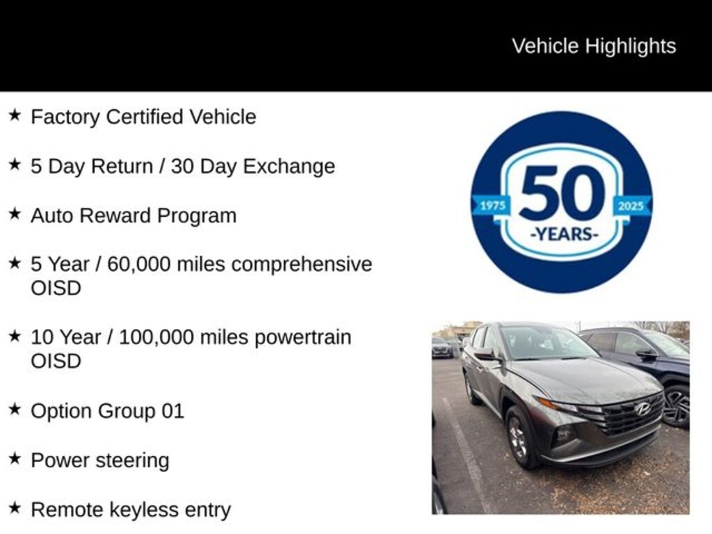 As a Hyundai Certified Used Vehicle, this Tucson SE has undergone a rigorous 173+ point inspection and is backed by a comprehensive warranty, including a 60-month/60,000-mile limited warranty and a 120-month/100,000-mile powertrain warranty. Additionally, you'll enjoy 10-year/unlimited mileage roadside assistance, a 3-month SiriusXM trial subscription, and a complimentary 1-year Connected Care & Remote Package.