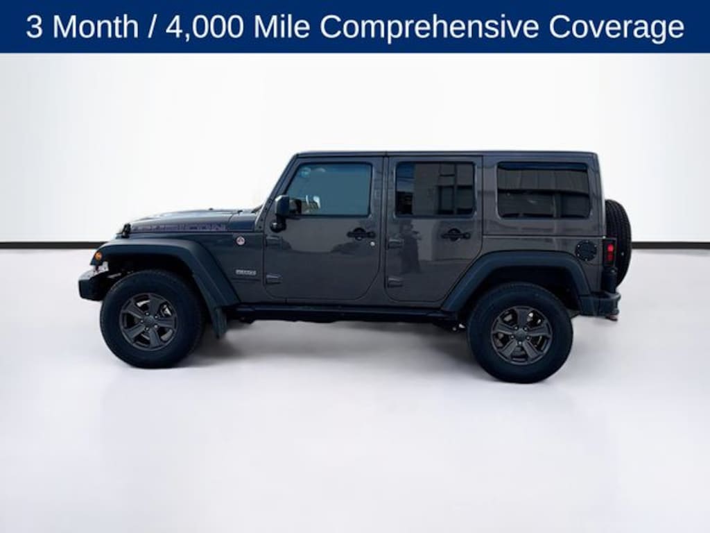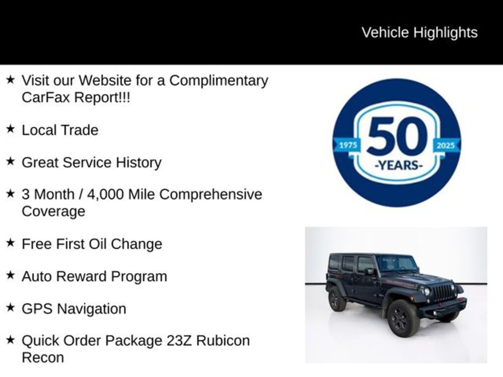 2018 Jeep Wrangler JK Unlimited Rubicon 3.6L V6 24V VVT 6-Speed Manual 4WD 4D Sport Utility Granite Crystal Metallic Clearcoat Visit our Website for a Complimentary CarFax Report!!!, Local Trade, Great Service History, 3 Month / 4,000 Mile Comprehensive Coverage, Free First Oil Change, Auto Reward Program, 6.5" Touchscreen Display, Accent Stitching, Air Conditioning w/Auto Temperature Control, Alpine 9-Speaker w/All Weather Subwoofer, Connectivity Group, Dana 44/226MM Rear Axle, Fully automatic headlights, GPS Navigation, HD Rock Rails w/Step Pad, Heated Front Seats, Hood w/Power Dome, Midnight Star Interior Accents, MOPAR Black Tail Lamp Guards, Premium Black Sunrider Soft Top, Quick Order Package 23Z Rubicon Recon, Recon Leather Seats, Recon Package, Red Front & Rear Tow Hooks, Red Seat Belts, Remote keyless entry, Steel Front Bumper, Steel Rear Bumper, Sunrider Soft Top, Uconnect Voice Command w/Bluetooth, 17" x 7.5" Polished Mineral Gray Wheels, 4-Wheel Disc Brakes, 4.10 Rear Axle Ratio, 40GB Hard Drive w/28GB Available, 5-Year SiriusXM Travel Link Service, 8 Speakers, ABS brakes, Air Conditioning, Air Filtering, Alloy wheels, AM/FM radio: SiriusXM, Audio Jack Input for Mobile Devices, Auto-dimming Rear-View mirror, Black Fuel Filler Door, Brake assist, CD player, Cloth Seats w/Adjustable Head Restraints, Compass, Dana M44/216MM Front Axle, Delete Sunrider Soft Top, Driver door bin, Driver Height Adjuster Seat, Driver vanity mirror, Dual front impact airbags, Electronic Stability Control, Freedom Panel Storage Bag, Front anti-roll bar, Front Bucket Seats, Front Center Armrest w/Storage, Front fog lights, Front reading lights, Front Seat Back Map Pockets, Heated door mirrors, Humidity Sensor, Illuminated entry, Integrated roll-over protection, Jeep Trail Rated Kit, Leather steering wheel, Logloss Granite Crystal Jeep Badge, Low Gloss Wrangler JK Decal, Low tire pressure warning, MOPAR Grab Handles, MOPAR Slush Mats w/Red Accents, Occupant sensing airbag, Outside temperature display, Panic alarm, Passenger door bin, Passenger vanity mirror, Performance Suspension, Power door mirrors, Power steering, Power windows, Premium EVIC Message Center, R1234YF A/C Refrigerant, Radio data system, Radio: 130, Radio: 430 Nav, Rear anti-roll bar, Rear Window Defroster, Rear Window Wiper/Washer, Recon Badge, Recon Decals, Recon Grille, Red Switches, Red Trail Rated Badge, Remote USB Port, Security system, SiriusXM Travel Link, Speed control, Split folding rear seat, Steering wheel mounted audio controls, Tachometer, Tilt steering wheel, Tire Pressure Monitoring Display, Traction control, Trip computer, Variably intermittent wipers, Vehicle Information Center, Wheels: 17" x 7.5" Granite Crystal Aluminum, 6.5" Touchscreen Display, Accent Stitching, Air Conditioning w/Auto Temperature Control, Alpine 9-Speaker w/All Weather Subwoofer, Connectivity Group, Dana 44/226MM Rear Axle, Fully automatic headlights, GPS Navigation, HD Rock Rails w/Step Pad, Heated Front Seats, Hood w/Power Dome, Midnight Star Interior Accents, MOPAR Black Tail Lamp Guards, Premium Black Sunrider Soft Top, Quick Order Package 23Z Rubicon Recon, Recon Leather Seats, Recon Package, Red Front & Rear Tow Hooks, Red Seat Belts, Remote keyless entry, Steel Front Bumper, Steel Rear Bumper, Sunrider Soft Top, Uconnect Voice Command w/Bluetooth.