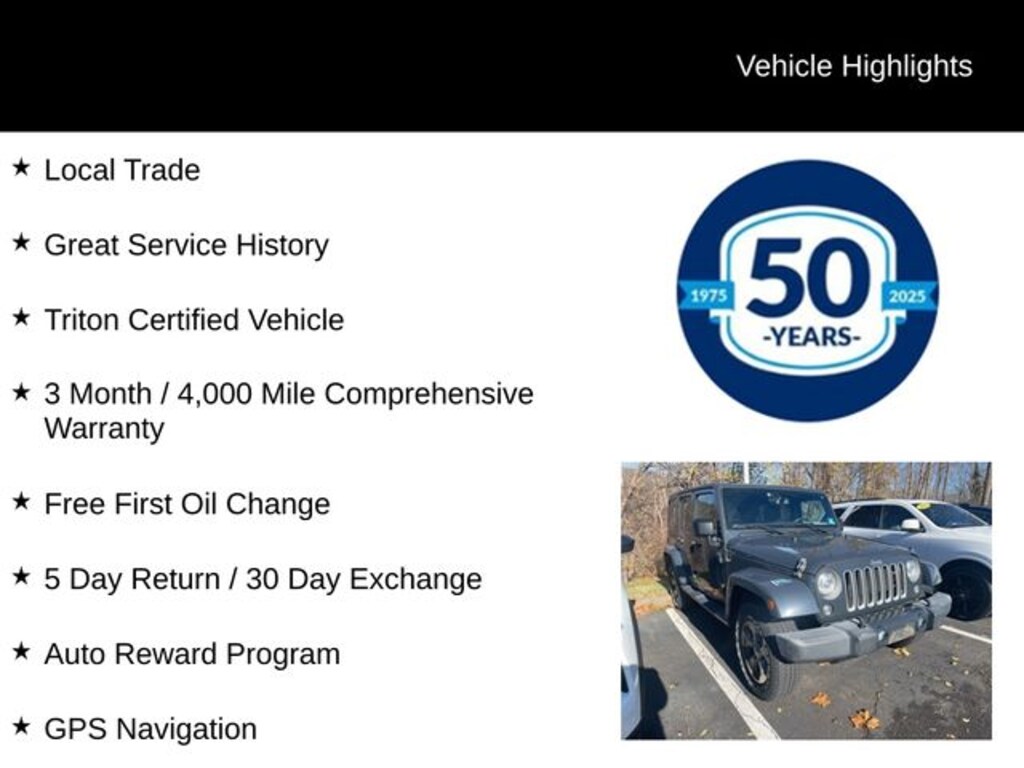 Recent Arrival! 2018 Jeep Wrangler JK Unlimited Sahara 3.6L V6 24V VVT 5-Speed Automatic 4WD 4D Sport Utility Rhino Clearcoat Local Trade, Great Service History, Triton Certified Vehicle, 3 Month / 4,000 Mile Comprehensive Warranty, Free First Oil Change, 5 Day Return / 30 Day Exchange, Auto Reward Program, Body Color Appliques Front Bumper, Body Color Appliques Rear Bumper, Body Color/Accent Color Grille, Connectivity Group, GPS Navigation, Quick Order Package 24G, Tire Pressure Monitoring Display, Uconnect Voice Command w/Bluetooth, Vehicle Information Center.