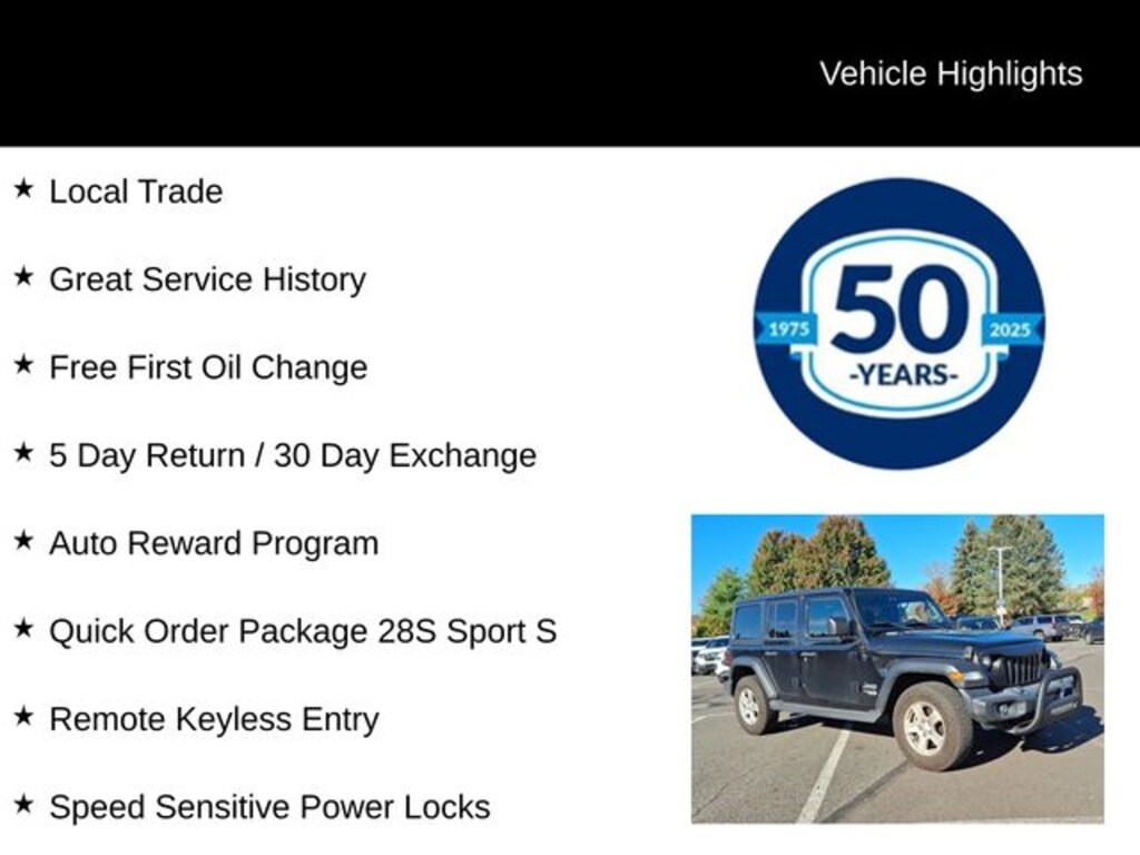 Recent Arrival! 2019 Jeep Wrangler Unlimited Sport S 2.0L I4 DOHC 8-Speed Automatic 4D Sport Utility Black Clearcoat Local Trade, Great Service History, Free First Oil Change, 5 Day Return / 30 Day Exchange, Auto Reward Program, Wrangler Unlimited Sport S, 4D Sport Utility, 2.0L I4 DOHC, 8-Speed Automatic, 4WD, Black Clearcoat, Black Cloth, Automatic Headlamps, Deep Tint Sunscreen Windows, Front 1-Touch Down Power Windows, Leather Wrapped Steering Wheel, Power Heated Mirrors, Quick Order Package 28S Sport S, Remote Keyless Entry, Security Alarm, Speed Sensitive Power Locks, Sun Visors w/Illuminated Vanity Mirrors, Wheels: 17" x 7.5" Tech Silver Aluminum.