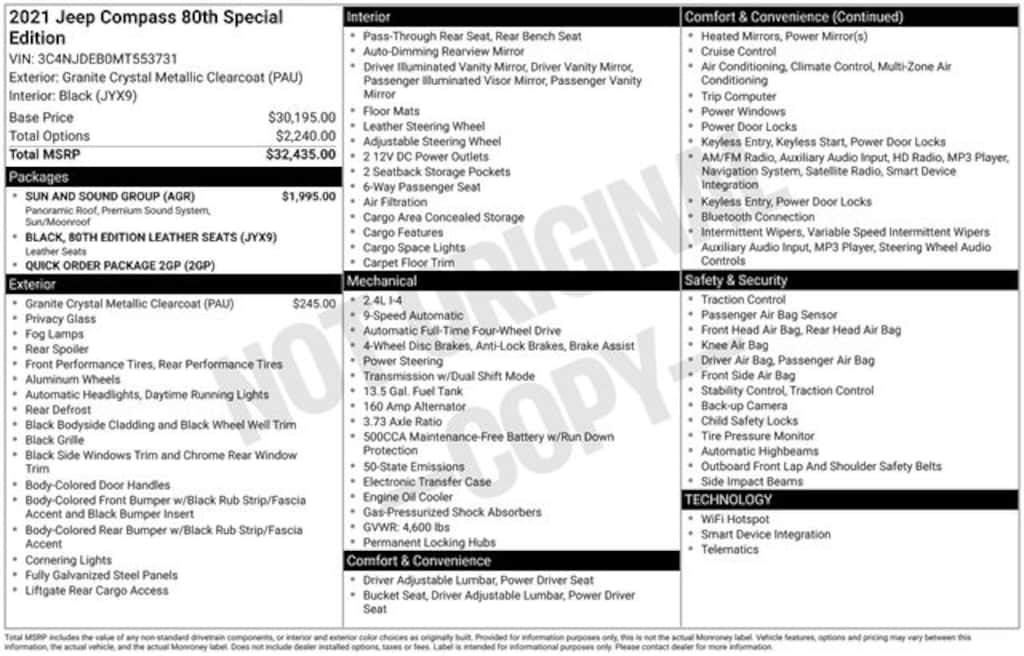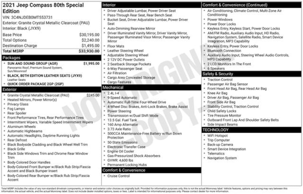 Whether you're embarking on a family adventure, commuting to work, or simply enjoying the thrill of the open road, the 2021 Jeep Compass 80th Special Edition is the perfect companion. Experience the perfect blend of capability, comfort, and technology that will elevate your driving experience to new heights.