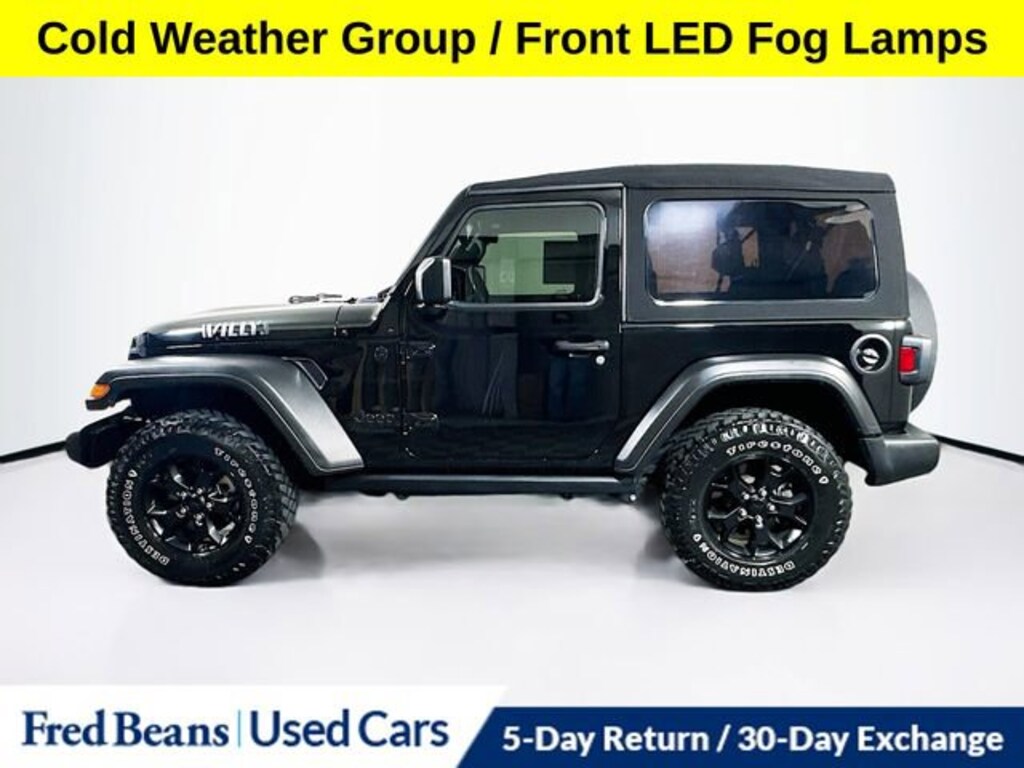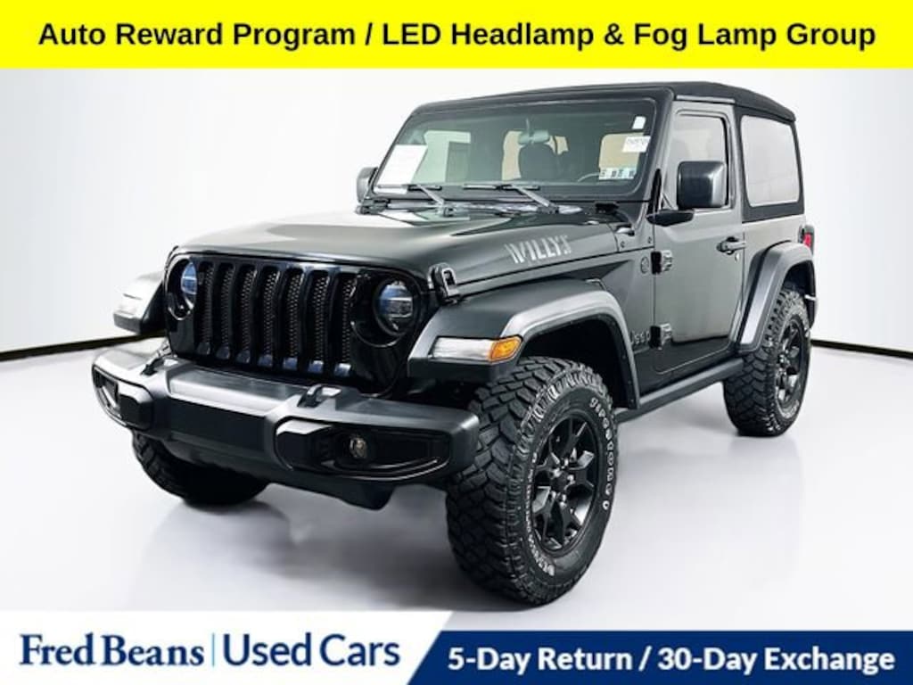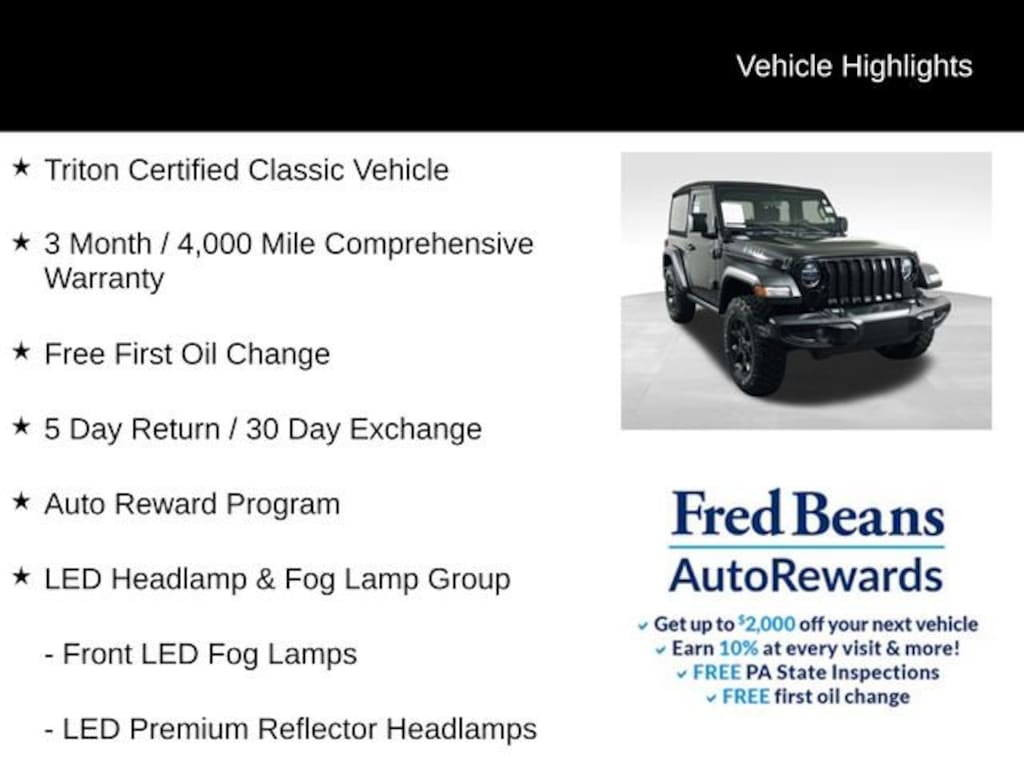 Clean CARFAX. CARFAX One-Owner.Recent Arrival! 2021 Jeep Wrangler Willys 2.0L I4 DOHC 8-Speed Automatic 4WD 2D Sport Utility Black Clearcoat Triton Certified Classic Vehicle, 3 Month / 4,000 Mile Comprehensive Warranty, Free First Oil Change, 5 Day Return / 30 Day Exchange, Auto Reward Program, Cold Weather Group, Front LED Fog Lamps, Heated Front Seats, Heated Steering Wheel, LED Headlamp & Fog Lamp Group, LED Premium Reflector Headlamps.Odometer is 6089 miles below market average!Certified. Certification Program Details: Triton Certified Shield Classic 3-Month or 4,000-Mile Comprehensive Coverage ($100 deductible) 100+ Multipoint Inspection PA State Inspection & Emissions Test Oil, Lube, & Filter Service Completed 5-Day Return Policy1 30-Day Exchange Policy2 CARFAXTM Report AutoRewards Membership See salesperson for additional offers & complete details.For better peace of mind all our used vehicles have a 127-point inspection and come with a 5-day return, 30-day exchange (As-Is vehicles are excluded). Our exclusive Auto Rewards Program provides better value with Free First Oil change, Free Pa State Safety inspections, discounts for local merchants and more. Plus, you can earn up to $2000 towards your next vehicle just by servicing with Fred Beans! As Fred Beans always says, our used cars are better because our reputation depends on it.Although every reasonable effort has been made to ensure the accuracy of the information contained on this site, absolute accuracy cannot be guaranteed. This site, and all information and materials appearing on it, are presented to the user as is without warranty of any kind, either express or implied. All vehicles are subject to prior sale. Price does not include applicable tax, title, license, processing and/or documentation fees. Vehicles shown at different locations are not currently in our inventory (Not in Stock) but can be made available to you at our location within a reasonable date from the time of your request, not to exceed one week. Residency restrictions may apply.