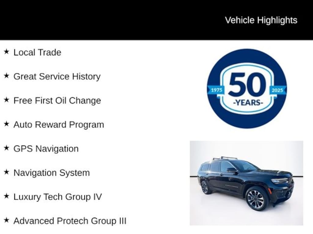 2022 Jeep Grand Cherokee L Overland 3.6L V6 24V VVT 8-Speed Automatic 4WD 4D Sport Utility Diamond Black Crystal Pearlcoat Local Trade, Great Service History, Free First Oil Change, Auto Reward Program, Active Driving Assist System, Adaptive suspension, Advanced Protech Group III, Apple CarPlay, ATC w/4 Zone Temp Control, Driver Power Seat Back Massage, Front fog lights, Front Passenger Power Seat Back Massage, Fully automatic headlights, GPS Navigation, Heads-Up Display, Heated steering wheel, Highway Assist System, Integrated Off-Road Camera, Interior Rear Facing Camera, Luxury Tech Group IV, Nappa Leather Seats (TL), Navigation System, Night Vision/Pedestrian-Animal Detection, Passenger Seat Memory, Power Adjust 12-Way Driver Seat, Power Adjust 12-Way Front Passenger Seat, Power driver seat, Power Liftgate, Power moonroof, Rear Back Up Camera Washer, Rearview Autodim Digital Display Mirror, Reclining 3rd row seat, Surround View Camera System, Wireless Charging Pad, 10 Speakers, 10.1" Touchscreen Display, 19 Speakers High Performance Audio, 2nd Row Manual Window Shades, 3.45 Rear Axle Ratio, 3rd row seats: split-bench, 4-Wheel Disc Brakes, 4G LTE Wi-Fi Hot Spot, 950 Watt Amplifier, ABS brakes, Active Noise Control System, Air Conditioning, All Radio Equipped Vehicles, Alloy wheels, AM/FM radio: SiriusXM with 360L, Anti-whiplash front head restraints, Audio memory, Auto High-beam Headlights, Auto-dimming door mirrors, Auto-dimming Rear-View mirror, Auto-leveling suspension, Automatic temperature control, Brake assist, Bumpers: body-color, Compass, Connected Travel & Traffic Services, Connectivity - US/Canada, Delay-off headlights, Disassociated Touchscreen Display, Driver door bin, Driver vanity mirror, Dual front impact airbags, Dual front side impact airbags, Electronic Stability Control, Emergency communication system, For Details, Visit DriveUconnect.com, For More Info, Call 800-643-2112, Four wheel independent suspension, Front anti-roll bar, Front Bucket Seats, Front Center Armrest w/Storage, Front dual zone A/C, Front reading lights, Garage door transmitter, Global Telematics Box Module (TBM), Google Android Auto, GPS Antenna Input, HD Radio, Heated door mirrors, Heated front seats, Heated rear seats, Illuminated entry, Integrated Center Stack Radio, Integrated Voice Command w/Bluetooth, Intersection Collision Assist System, Knee airbag, Leather steering wheel, Low tire pressure warning, Map-In-Cluster Display, Memory seat, Nappa Leather Seats, Normal Duty Suspension, Occupant sensing airbag, Outside temperature display, Overhead airbag, Overhead console, Panic alarm, Passenger door bin, Passenger vanity mirror, Power door mirrors, Power Fold Seatbacks, Power passenger seat, Power steering, Power windows, Quick Order Package 22N, Radio data system, Radio: Uconnect 5 Nav w/10.1" Display, Radio: Uconnect 5 Nav w/8.4" Display, Rain sensing wipers, Rear air conditioning, Rear anti-roll bar, Rear reading lights, Rear window defroster, Rear window wiper, Remote keyless entry, Security system, SiriusXM Radio Service, SiriusXM Satellite Radio, SiriusXM w/360L, Speed control, Speed-Sensitive Wipers, Split folding rear seat, Spoiler, Steering wheel memory, Steering wheel mounted audio controls, Tachometer, Telescoping steering wheel, Tilt steering wheel, Traction control, Trip computer, Turn signal indicator mirrors, USB Host Flip, Variably intermittent wipers, Ventilated front seats, Voltmeter, Wheels: 20" x 8.5" Machined Face Aluminum, Active Driving Assist System, Adaptive suspension, Advanced Protech Group III, Apple CarPlay, ATC w/4 Zone Temp Control, Driver Power Seat Back Massage, Front fog lights, Front Passenger Power Seat Back Massage, Fully automatic headlights, GPS Navigation, Heads-Up Display, Heated steering wheel, Highway Assist System, Integrated Off-Road Camera, Interior Rear Facing Camera, Luxury Tech Group IV, Nappa Leather Seats (TL), Navigation System, Night Vision/Pedestrian-Animal Detection, Passenger Seat
