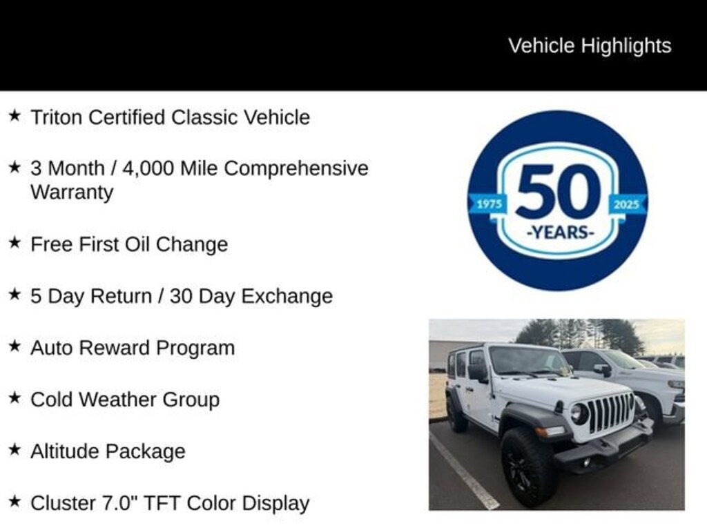 Discover the exceptional 2022 Jeep Wrangler Unlimited Sport Altitude, a true off-road icon that combines rugged capability with refined style. This stunning white Wrangler is equipped with a powerful 2.0L I4 DOHC engine and an 8-speed automatic transmission, delivering impressive performance and 4-wheel drive prowess. Triton Certified Classic Vehicle 3 Month / 4,000 Mile Comprehensive Warranty Free First Oil Change 5 Day Return / 30 Day Exchange Auto Reward Program Quick Order Package 22L Altitude Cold Weather Group Technology Group Apple CarPlay/Android Auto Cluster 7.0 TFT Color Display Heated Steering Wheel Leather Wrapped Steering Wheel Heated Front SeatsThis Wrangler Unlimited Sport Altitude is more than just a rugged off-road machine. It's a meticulously maintained, Triton Certified Classic Vehicle, backed by a comprehensive 3-month/4,000-mile warranty and a host of premium features. Indulge in the convenience of remote keyless entry, the comfort of heated front seats and a heated steering wheel, and the connectivity of Apple CarPlay and Android Auto. Experience the ultimate in open-air driving with the freedom of the Wrangler's iconic design.Boasting a city fuel economy of 21 MPG and a highway rating of 24 MPG, this Wrangler Unlimited Sport Altitude delivers a balance of capability and efficiency. The Quick Order Package 22L Altitude, Cold Weather Group, and Technology Group further enhance the driving experience, providing advanced technology, premium comfort, and exceptional value.As a Triton Certified Classic Vehicle, this 2022 Jeep Wrangler Unlimited Sport Altitude has undergone a thorough inspection and reconditioning process to ensure it meets the highest standards of quality and performance. With a 3-month/4,000-mile comprehensive warranty and a free first oil change, you can drive with confidence, knowing that your investment is protected.Discover the unparalleled freedom and capability of the 2022 Jeep Wrangler Unlimited Sport Altitude. Schedule a test drive today and experience the thrill of owning this exceptional off-road icon.