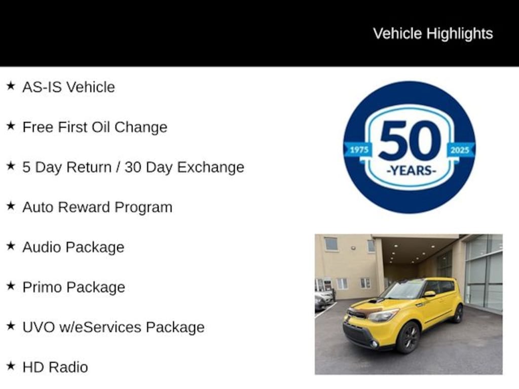 Recent Arrival! 2014 Kia Soul Plus I4 6-Speed Automatic FWD 4D Hatchback Solar Yellow AS-IS Vehicle, Free First Oil Change, 5 Day Return / 30 Day Exchange, Auto Reward Program, 10-Way Power Adjustable Driver's Seat, ABS brakes, Audio Package, Auto On/Off Headlights, Automatic Temperature Control, Engine Immobilizer, Front Fog Lights, HD Radio, Heated & Ventilated Front Seats, Heated door mirrors, Heated Outboard Rear Seats, Heated Steering Wheel, Leather Seat Trim, Leather-Wrapped Steering Wheel & Gear Shift Knob, Leatherette Instrument Hood/Door Center/Armrests, Panoramic Sunroof w/Power Sunshade, Piano Black Interior Accents, Primo Package, Push Button Start, Radio: Navigation w/Infinity Audio System, Rear-Camera Display, Satin Chrome Interior Door Handles, Upgraded Cloth Seat Trim, UVO w/eServices Package.