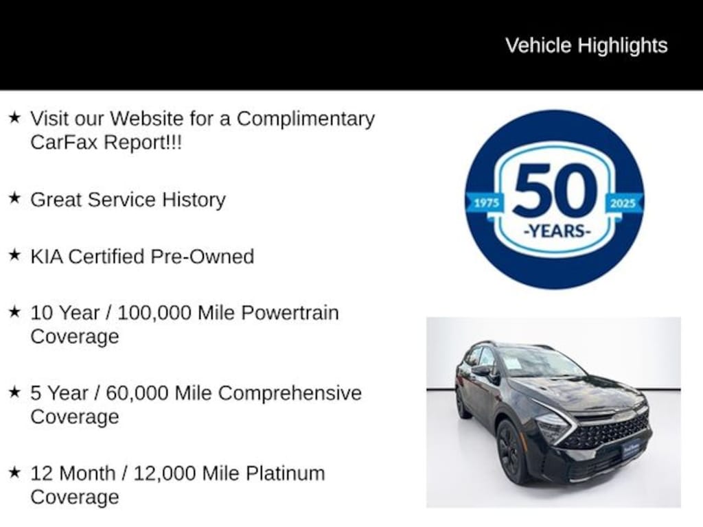 • KIA Certified Pre-Owned with 10-year/100,000-mile Powertrain Coverage and 12-month/12,000-mile Platinum Coverage