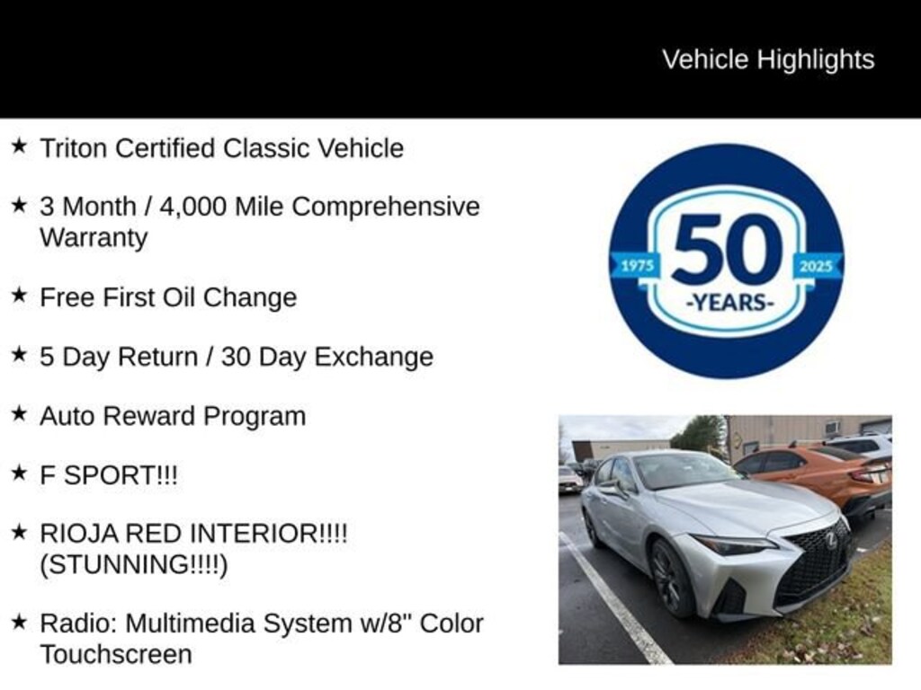Recent Arrival! 2023 Lexus IS 350 F SPORT 3.5L V6 DOHC Dual VVT-i 24V 6-Speed Automatic AWD 4D Sedan Silver Triton Certified Classic Vehicle, 3 Month / 4,000 Mile Comprehensive Warranty, Free First Oil Change, 5 Day Return / 30 Day Exchange, Auto Reward Program, F SPORT!!!, RIOJA RED INTERIOR!!!! (STUNNING!!!!), AWD, Rioja Red Artificial Leather, Apple CarPlay/Android Auto, Radio: Multimedia System w/8 Color Touchscreen.
