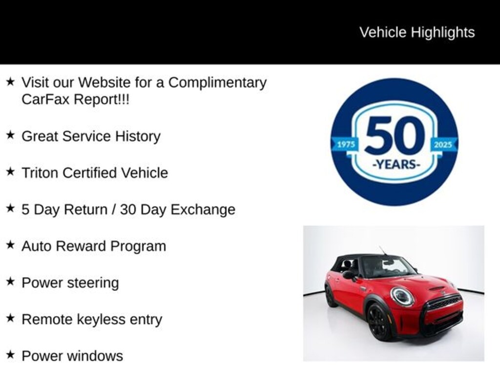 As a Triton Certified vehicle, this MINI has undergone a rigorous inspection and comes with the peace of mind of the remainder of the factory warranty. Our dedicated team is here to guide you through the ownership experience and ensure your complete satisfaction.