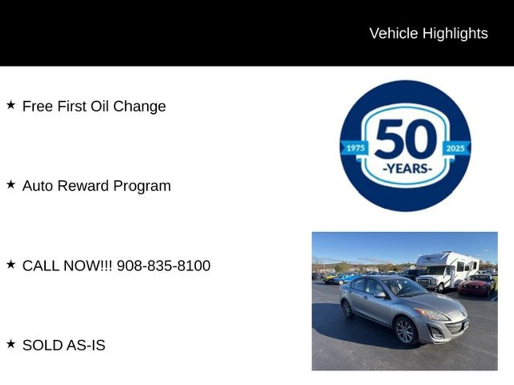 Free First Oil Change, Auto Reward Program, CALL NOW!!! 908-835-8100, SOLD AS-IS, AN ESTIMATE OF NEEDED REPAIRS IS AVAILABLE, THE LIST OF NEEDED REPAIRS INCLUDES: 4 NEW TIRES, REPAIRING A MINOR OIL LEAK AT THE TRANSMISSION PAN GASKET, ABS/TRACTION CONTROL SYSTEM DIAGNOSIS, OIL AND FILTER CHANGE, ENGINE AIR FILTER, BRAKES MEASURE 5 MM FRONT AND 6 MM REAR, TIRES MEASURE 4/32 FRONT AND 4/32 REAR, THE VEHICLE IS SOLD AS-IS AND THE BUYER IS RESPONSIBLE FOR ALL REPAIRS, THE RETAIL PRICE HAS BEEN ADJUSTED (LOWERED) TO ACCOUNT FOR THE NEEDED REPAIRS. New Price! Recent Arrival! 2010 Mazda Mazda3 s Sport 2.5L 4-Cylinder DOHC 16V PZEV 5-Speed Automatic FWD 4D Sedan Liquid Silver Metallic 22/29 City/Highway MPG