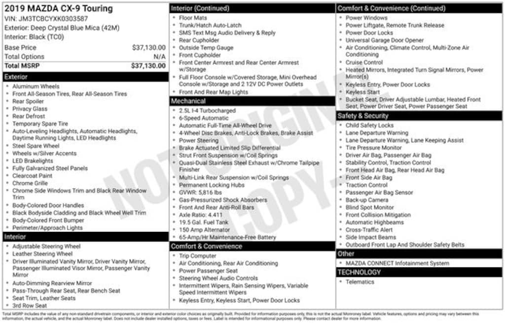 2019 Mazda CX-9 Touring 2.5L 4-Cylinder 6-Speed Automatic AWD 4D Sport Utility Deep Crystal Blue Mica CLEAN CARFAX - ONE OWNER, FULLY SERVICED, 5 Day Return / 30 Day Exchange, Auto Reward Program, Bought & Serviced at Fred Beans, AWD. 20/26 City/Highway MPG