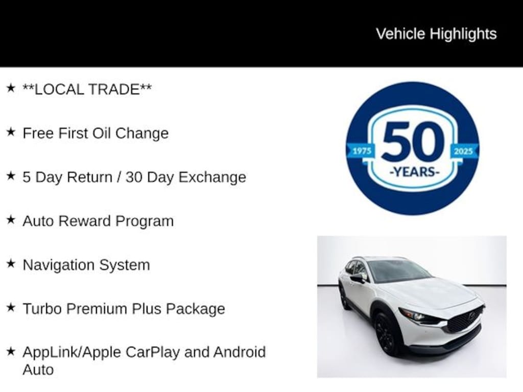 **LOCAL TRADE**, Free First Oil Change, 5 Day Return / 30 Day Exchange, Auto Reward Program, AppLink/Apple CarPlay and Android Auto, Navigation System, Turbo Premium Plus Package, 12 Speakers, 3.841 Axle Ratio, 4-Wheel Disc Brakes, ABS brakes, Air Conditioning, Alloy wheels, AM/FM radio: SiriusXM, Auto High-beam Headlights, Auto-dimming door mirrors, Auto-dimming Rear-View mirror, Automatic temperature control, Brake assist, Bumpers: body-color, Compass, Delay-off headlights, Driver door bin, Driver vanity mirror, Dual front impact airbags, Dual front side impact airbags, Electronic Stability Control, Emergency communication system: MAZDA CONNECT, Front anti-roll bar, Front Bucket Seats, Front Center Armrest, Front dual zone A/C, Front reading lights, Front wheel independent suspension, Fully automatic headlights, Garage door transmitter: HomeLink, Heads-Up Display, Heated door mirrors, Heated Front Bucket Seats, Heated front seats, Heated steering wheel, Illuminated entry, Knee airbag, Leather Seat Trim, Leather Shift Knob, Leather steering wheel, Low tire pressure warning, MAZDA CONNECT Infotainment System Voice Command, Memory seat, Occupant sensing airbag, Outside temperature display, Overhead airbag, Overhead console, Panic alarm, Passenger door bin, Passenger vanity mirror, Power door mirrors, Power driver seat, Power Liftgate, Power moonroof, Power steering, Power windows, Radio data system, Radio: AM/FM Audio System w/Mazda Navigation, Rain sensing wipers, Rear seat center armrest, Rear window defroster, Rear window wiper, Remote keyless entry, Roof rack: rails only, Snowflake White Pearl Mica Paint, Speed control, Speed-sensing steering, Split folding rear seat, Spoiler, Steering wheel mounted audio controls, Tachometer, Telescoping steering wheel, Tilt steering wheel, Traction control, Trip computer, Turn signal indicator mirrors, Variably intermittent wipers, Wheels: 18" x 7J Black Alloy, AppLink/Apple CarPlay and Android Auto, Navigation System, Turbo Premium Plus Package.