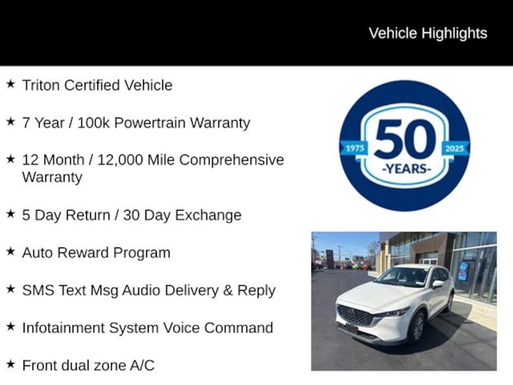 This Triton Certified vehicle has undergone a rigorous inspection process, giving you the peace of mind of a like-new vehicle with the added benefits of our comprehensive warranty and exchange program. With low mileage and a wealth of premium features, this CX-5 is the perfect choice for the discerning driver.